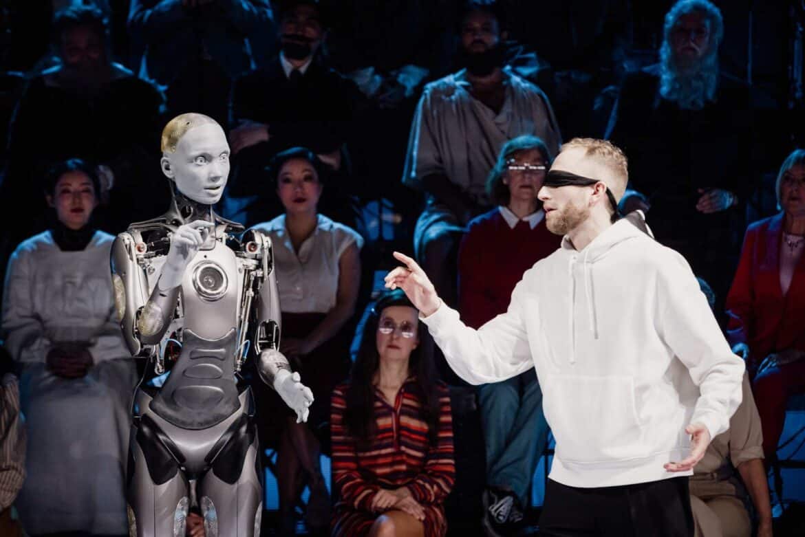 L’Opéra National de Lorraine a préféré cependant nous présenter l’œuvre de Haydn sous la forme scénique tout à fait particulière conçue par Kevin Barz. En effet, sur une scène constituée de panneaux vidéo LED, trouvaient place vingt-huit choristes assis sur cinq gradins, quatorze hommes et quatorze femmes provenant des différentes époques de l’histoire de l’humanité européenne, et qu’on découvrira petit à petit comme étant les représentants des sciences à travers les siècles : Copernic, Galilée, Kepler, Newton, Einstein, Marie Curie, et beaucoup d’autres encore. Tout au long de l’exécution, sans interruptions, des images ont été projetées, soit réalisées numériquement, soit animées grâce à la réalité virtuelle. Par rapport aux contenus des textes chantés, elles étaient tantôt en parfaite cohérence (descriptions des terres, des eaux, des animaux etc.), tantôt fortement contradictoires ou ironiques. Ce dernier cas s’est présenté lorsque le trio des trois archanges célèbre le grand nombre d’œuvres créées par Dieu tandis que l’on voit apparaître des séquences de multiplication cellulaire ; ou quand Uriel annonce que « Dieu créa l’humain à son image » : on voit alors apparaître les images d’un modèle d’ADN, et puis celles d’un chimpanzé, qui évolue enfin en homme de Neandertal. Cette manière particulière d’illustrer le texte mis en musique par Haydn, de plus en plus divergente de celui-ci, atteint son apothéose sur les dernières notes de l’oratorio, quand un véritable androïde, capable de reproduire les expressions faciales, est introduit sur scène par quatre techniciens.