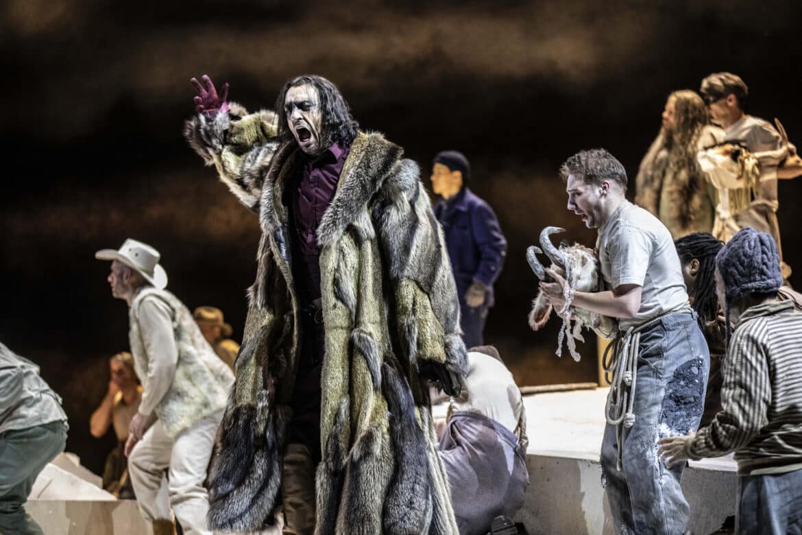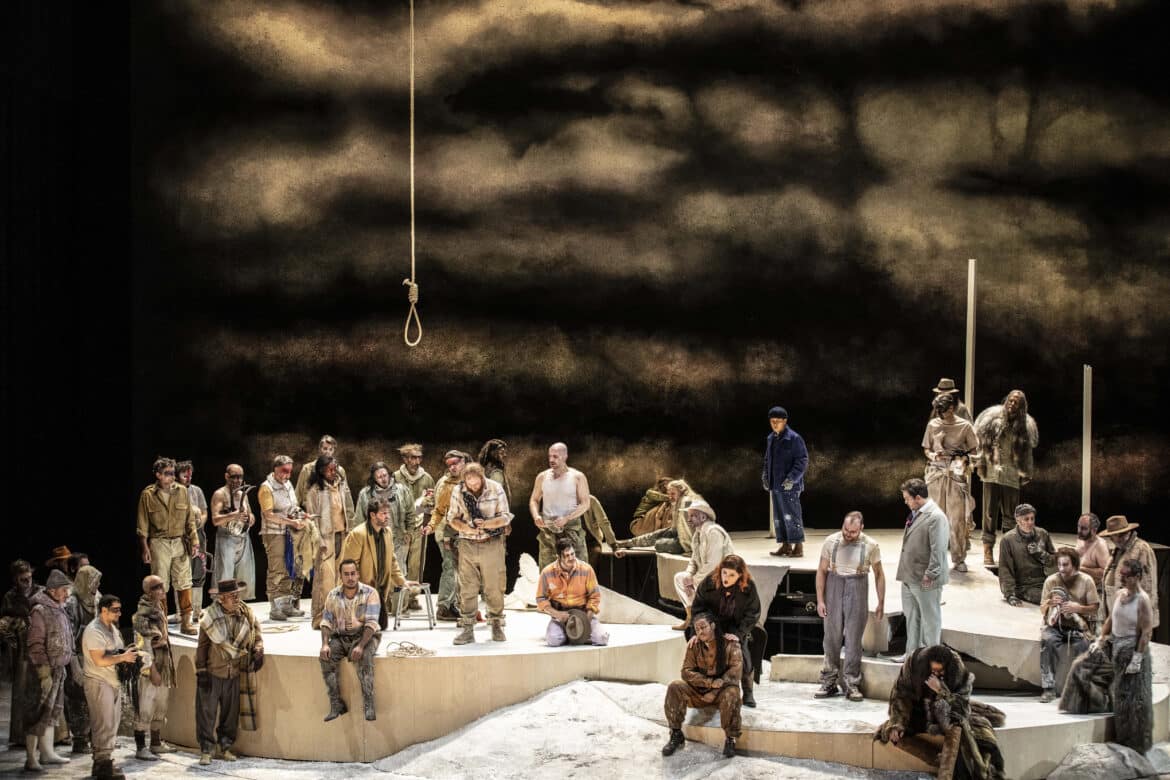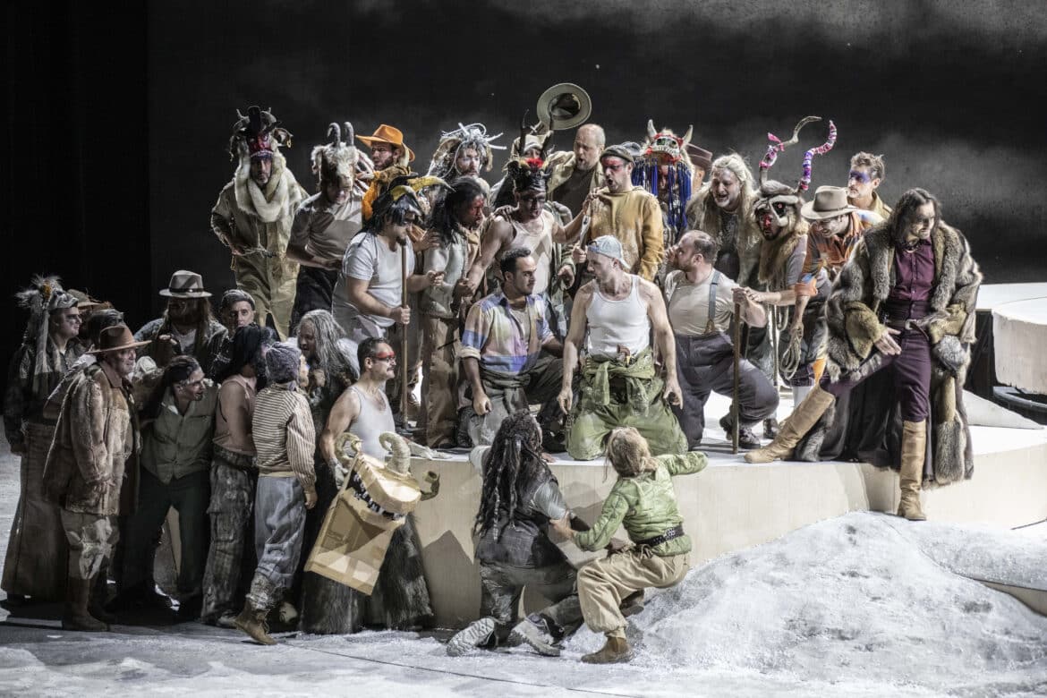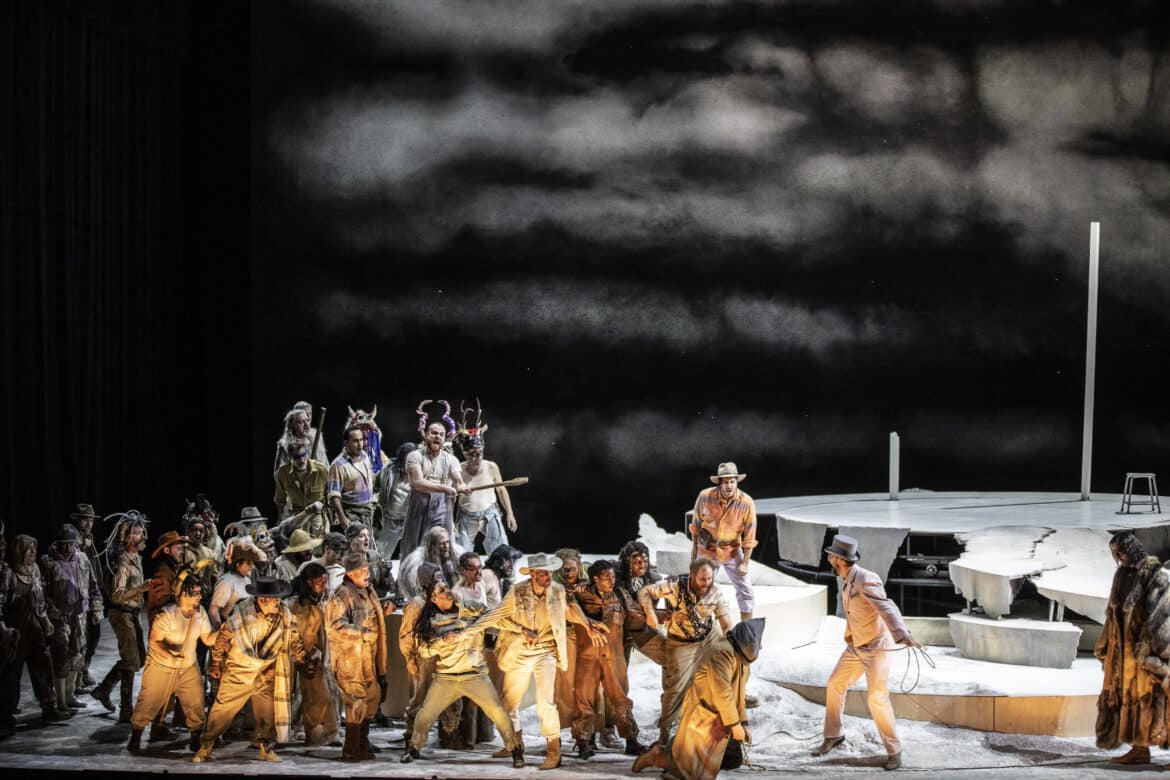 Le spectacle proposé par Tatjana Gürbaca a le bon goût de ne pas faire dire à l’œuvre de Puccini ce qu’elle ne dit pas. Certains lui ont reproché l’absence d’une vraie lecture, d’une véritable « vision ». Ce sont selon nous, la scénographie de Marc Weeger, d’une austérité un peu lassante (même si les décors sont superbement animés par les éclairages magnifiques de Stefan Bolliger) et les costumes de Dinah Ehm (inégaux : ceux de Rance et Johnson sont très réussis, ceux de Minnie aux deux premiers actes beaucoup moins…) qui déçoivent un peu. Si le spectacle reste un peu sage, on apprécie une caractérisation fine des personnages, notamment celle du shérif Rance : à rebours d’une tendance aujourd’hui sur-représentée qui fait du moindre personnage masculin (même l’amoureux transi a priori le plus inoffensif) un monstre brutal et insensible, Tatjana Gürbaca fait de Jack Rance un homme certes violent et peu sympathique, mais dont la brutalité s’explique par le fait de n’avoir, comme il le dit lui-même, « jamais aimé ni été aimé ». Rance n’est pas Scarpia : la scène du poker rappelle certes le second acte de Tosca, mais Scarpia ne se serait jamais embarrassé d’une partie de cartes pour attendre d’être fixé sur le fait de pouvoir posséder ou non la femme convoitée ! Lors du départ final de Minnie et Dick vers les montagnes de la Sierra Nevada, Rance braque un instant son revolver sur le couple d’amoureux, avant de le pointer vers sa tempe dans un acte de désespoir. Une subtilité de lecture appréciable, qui trouve sa source dans le livret et non dans l’imagination du metteur en scène, et qui tranche agréablement sur certaines caractérisations « à l’emporte-pièce » !