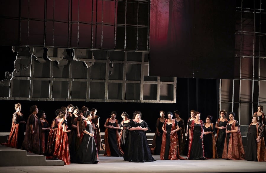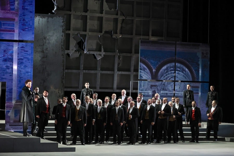 La dramaturgie pauvre offerte par le livret a suggéré au metteur en scène une lecture totalement statique. Les seuls mouvements sur scène sont ceux des panneaux ou du chœur, lorsque la moitié des choristes entre par la gauche et l’autre par la droite : les choristes se croisent au milieu, certains  montent trois marches, d’autres les descendent ; les hommes se pavanent à tribord et les femmes font une élégante figuration à gauche. Une chorégraphie qui se répète inlassablement au fil des actes. Les chanteurs n’ont pas l’occasion d’intensifier les duos ni les concertati, et l’immobilité de la protagoniste semble contaminer presque tout le monde sur scène. Le fait qu’après l’indicible torture, tant Béatrice qu’Orombello se présentent sans une égratignure, parfaitement coiffés et habillés, n’est pas si surprenant. En comparaison, la production parisienne de Peter Sellars, récemment chroniquée, avait au moins offert quelques raisons supplémentaires de s’intéresser à l’œuvre.