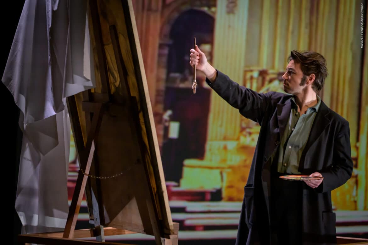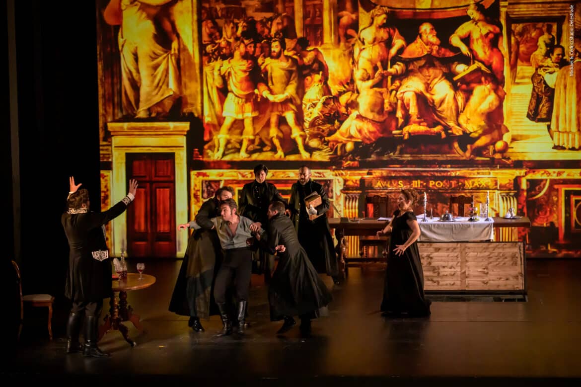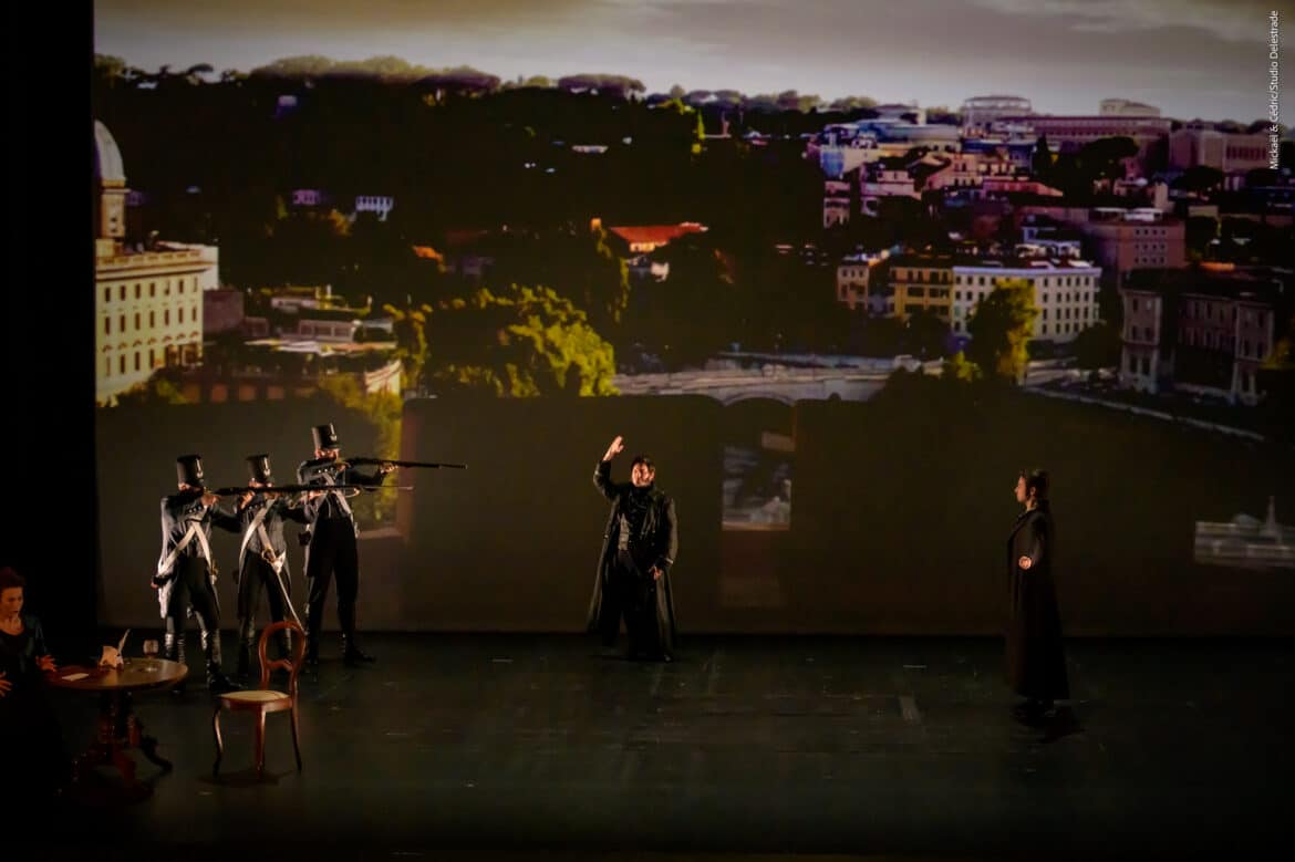 Facilité ? Réalisme et clarté du propos qui permetten de se concentrer sur l’intrigue elle-même, nous transportant à Sant’Andrea della Valle, puis au Palais Farnèse et enfin au château Saint-Ange – le tout grâce à des projections vidéo captées in situ par Julien Soulié. Les lieux s’animent, les couleurs changent, les effets sont rares, sans recherche de stylisation. Une façon de refaire au théâtre, le film tourné dans les lieux mêmes du drame[3] ? Une vision personnelle et respectueuse, donnant une véritable cohérence à la représentation, offrant quelques images fortes pour un beau spectacle qui rend l’opéra populaire.