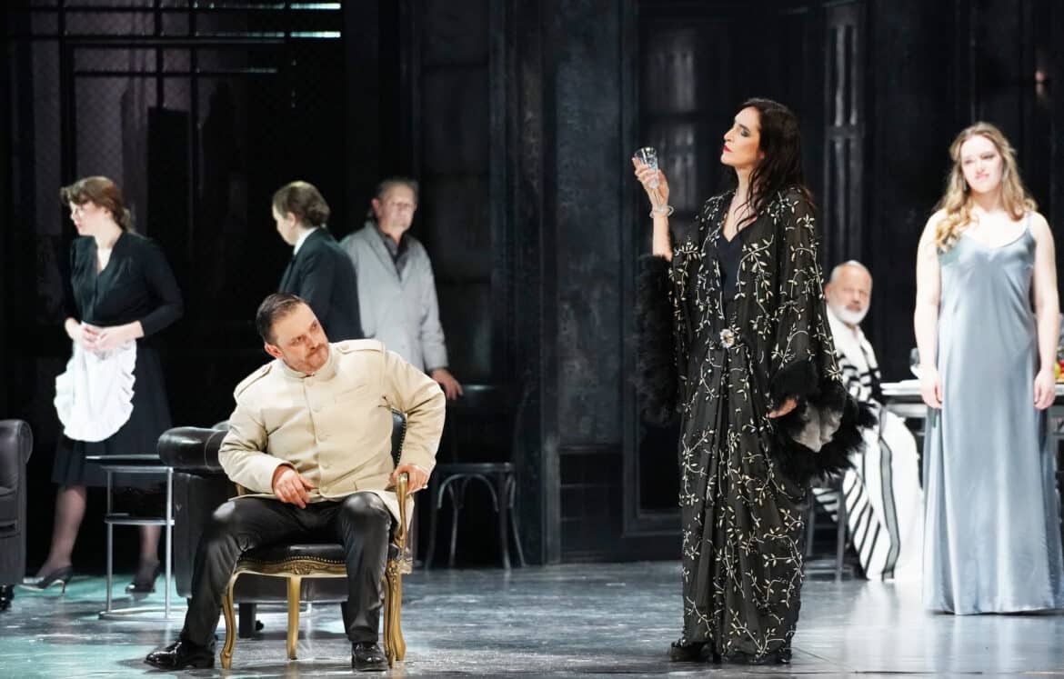 Débarrasser Salomé de ses cothurnes et de ses voiles est le droit le plus absolu du metteur en scène s’il est capable d’effectuer une transposition pertinente du lieu et de l’époque de l’histoire qu’il entend raconter. Helmut Stürmer est le concepteur d’un décor unique et plutôt élégant qui aurait pu donner une certaine cohérence au spectacle : le rideau s’ouvre en effet sur le hall d’un hôtel ou la salle d’un café viennois de l’époque de la Sécession, contemporain de Richard Strauss. Les robes dans le goût de Fortuny que portent Salomé et Hérodias évoquent les silhouettes longilignes de Gustav Klimt et il pouvait sembler intelligent de situer l’intrigue d’une passion incestueuse et mortifère sous le patronage de Freud et des débuts de la psychanalyse. Las, Joël Lauwers passe littéralement à côté de sa mise en scène.