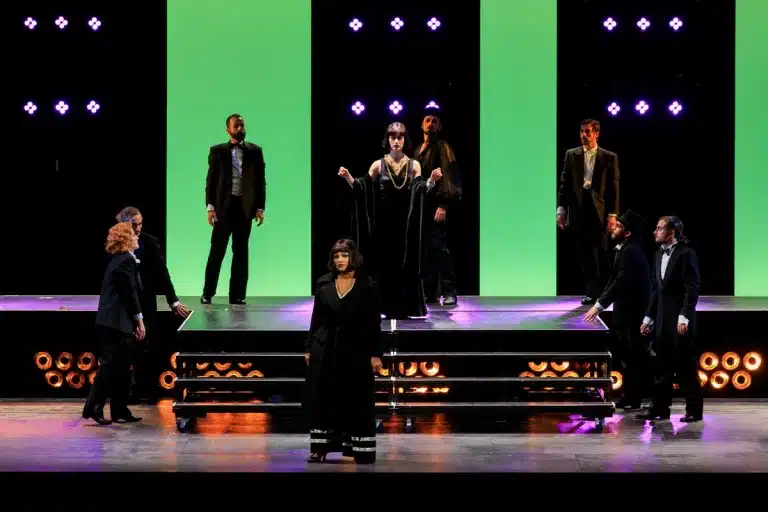 Die sieben Todsünden, créée à Paris le 12 juin 1933, est le dernier fruit de la collaboration entre Kurt Weill et Bertolt Brecht qui, après avoir fui l’Allemagne nazie, ont créé une satire incisive de la civilisation américaine, imaginant deux sœurs voyageant dans sept villes des États-Unis dans le but de gagner de l’argent pour l’envoyer à leur famille en Louisiane. Les deux sœurs sont interprétées par Danielle De Niese et Irene Ferrara ; leur famille par Marco Miglietta et Andrea Giovannini, Nicolò Ceriani et Andrea Concetti. Dans cette partie, les costumes (créés par Giada Masi) sont flamboyants et passent du monde du cabaret à celui du cinéma ou du cirque, tandis que les décors (conçus par Angelo Linzalata) restent essentiels.