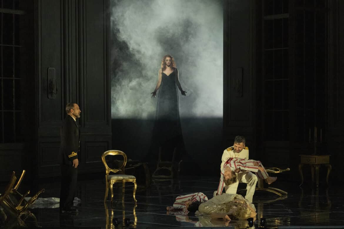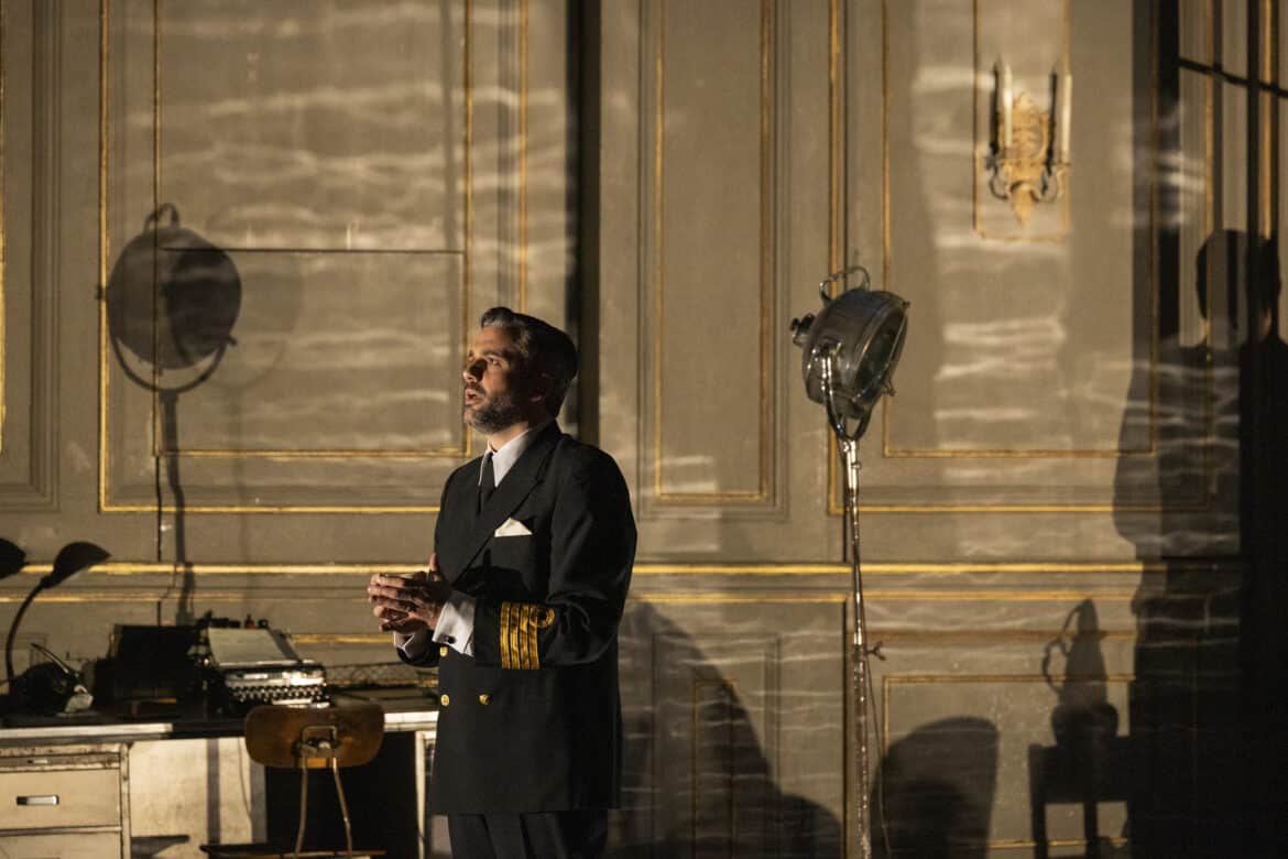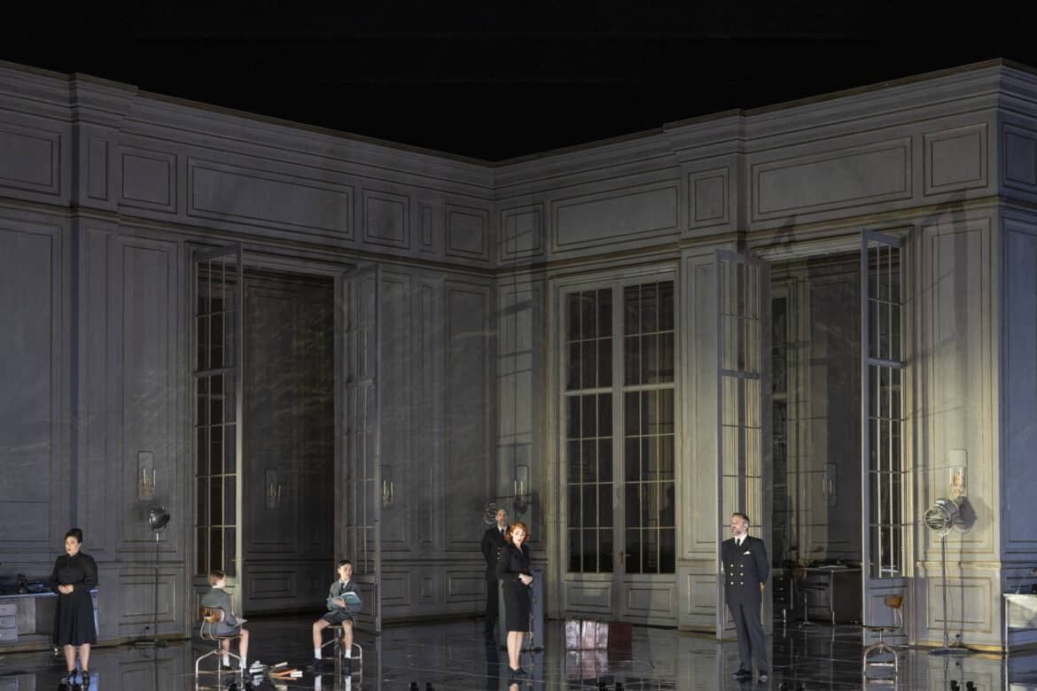 Premier artisan de cette réussite : David McVicar, qui propose si ce n’est une nouvelle production de l’œuvre (le spectacle a déjà été donné à Londres et à Genève), du moins un spectacle nouveau pour l’Opéra de Paris. Sa lecture paraitra sans doute (trop) classique aux partisans des mises en scène absconses, où le spectateur passe l’essentiel de son temps à essayer de comprendre les choix du metteur en scène plutôt qu’à se laisser émouvoir par le drame et la musique. L’action fait l’objet d’une transposition assez sage : nous sommes au début des années 40, de toute évidence dans les bureaux du ministère de l’armée. Jason fait partie de la Royal Navy, Oronte est un membre de la Royal Air Force – leurs hommes étant placés sous l’autorité du général Créon. Une fois accepté ce parti pris, la dramaturgie suit le cours de la tragédie en en respectant les enjeux, les temps forts, le rythme propre, sans chercher à plaquer sur elle un discours qui lui serait étranger. La première partie (actes I et II) nous laisse un peu sur notre faim : elle est surtout joliment « décorative » (mais est-ce ce que l’on attend de Médée ?…) et souffre d’une caractérisation des personnages insuffisamment tranchée : Médée est-elle avant tout une victime ? une créature maléfique et inquiétante ? une manipulatrice ? Jason est-il, comme il le dit lui-même, victime d’un « charme » (au sens fort du terme) contre lequel il ne peut lutter ? Ou un « salaud total », pour reprendre la (grotesque) traduction d’Euripide par Pierre Judet de La Combe dans la mise en scène de Lassalle (en 2000, à Avignon, avec Isabelle Huppert) ? Le spectacle, par ailleurs, est typique de ce qui faisait dans les années 2000-2010 (il fut créé à l’English National Opera en 2013) : on retrouve (presque) avec nostalgie ces immenses portes insérées dans de grands murs nus et ces fameuses chaises qu’on renverse d’un geste rageur quand on est en colère. Mais dès le troisième acte, avec l’arrivée des « noires filles du Styx », la lecture de McVicar prend une autre dimension et la vision du metteur en scène écossais revêt les dimensions à la fois tragiques et fantastiques qui siéent à l’œuvre, avec une noirceur qui ira grandissant au fil des tableaux pour culminer dans une scène finale glaçante. Au crédit du metteur en scène, il faut également porter une insertion habile et quasi naturelle des longs intermèdes dansés dans le déroulé de l’intrigue, la qualité visuelle du spectacle étant par ailleurs rehaussée par les beaux décors et costumes de Bunny Christie et les superbes éclairages de Paule Constable.