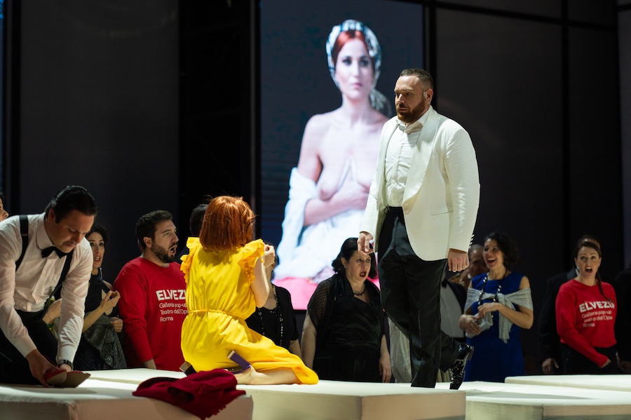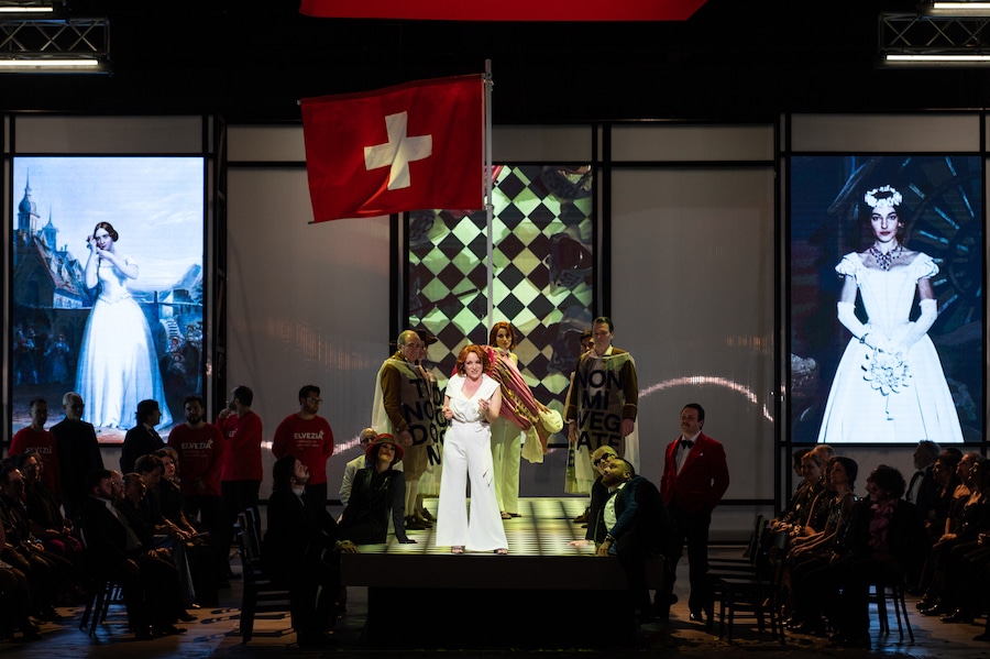 La Suisse, totalement absente dans le récent Guillaume Tell de la Scala, est bien présente dans La sonnambula qui se donne actuellement maintenant au Costanzi de Rome, mais seulement dans le nom de la galerie d’art « Elvezia », qu’Elvino a louée pour son mariage avec Amina… Car l’histoire, dans cette mise en scène, se déroule à Rome où la jeune fille, après avoir visité le Palais Barberini, s’endort dans une chambre de l’Hôtel Quirinale. L’hôtel est relié au Teatro dell’Opera par une porte située dans le jardin qui donne directement sur le couloir des loges de gauche : Domenico Costanzi fit d’abord construire l’hôtel Quirinale le long de la nouvelle Via Nazionale en 1874 et en 1880, sur le terrain attenant, l’opéra qui manquait encore à la nouvelle capitale. L’architecte des deux bâtiments avait conçu ce passage qui était régulièrement emprunté par les artistes séjournant à l’hôtel, de Verdi à Callas, et un portrait de la Divina, l’un des nombreux accrochés aux murs de la galerie, est d’ailleurs présenté dans l’exposition. Il s’agit en fait de vidéos grâce auxquelles on peut voir des chefs-d’œuvre du passé comme la Madeleine pénitente de Vouet revisitée dans un style contemporain, ou la Velata de Corradini, devenue le « monument de la mère disparue » d’Elvino sur lequel les deux jeunes gens s’étreignent de façon très irrévérencieusement et inconfortable !