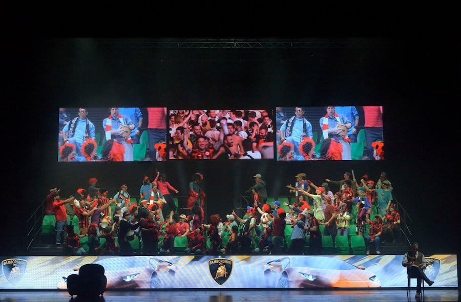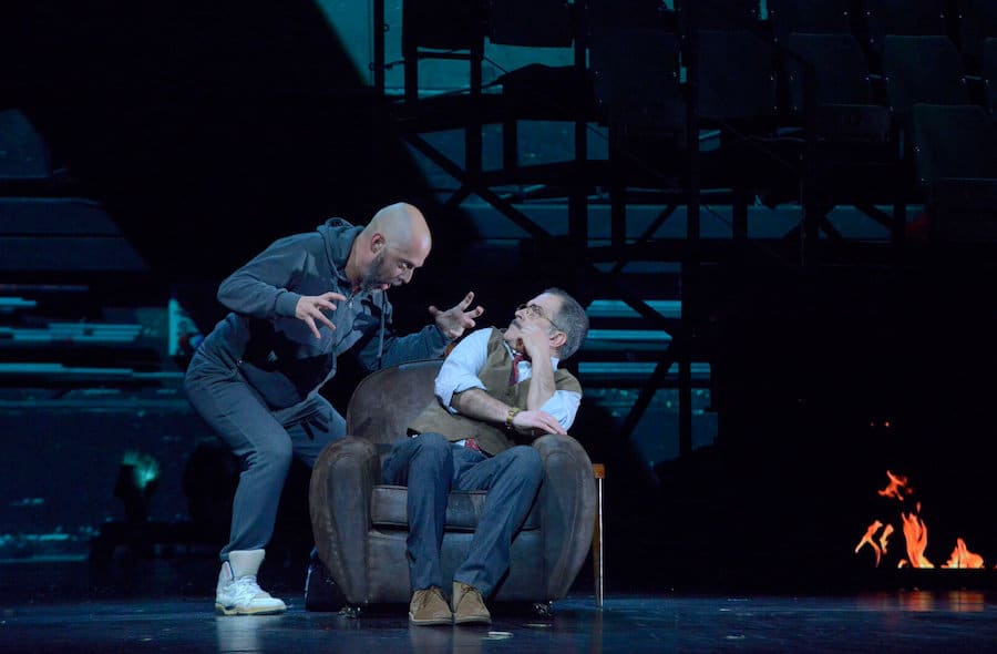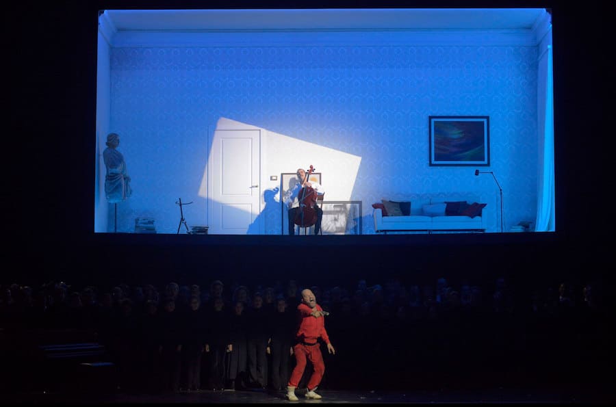 Le prologue ne se déroule pas au ciel, mais dans le salon de Méphistophélès qui, après avoir remis sa partition au chef d’orchestre, enlève ses cornes, se déshabille et se douche. Puis il remet son sweat-shirt et s’enfonce dans le fauteuil où, au lieu de phalanges célestes et de chœurs mystiques, il suit une émission avec le pape : la télécommande, ne fonctionnant pas, contraint le diable à suivre CattoTv ! La scène représente les coulisses d’un théâtre vide, mais d’en haut descend la loge/chambre de Faust, et n’était un violoncelle appuyé sur une chaise, on prendrait le personnage pour un employé à la figure sombre, le type d’homme qu’il faut appâter et à qui il faut promettre des services afin qu’il puisse assouvir ses désirs dans cette vie. En effet, après la scène de la fête de Pâques magnifiquement réalisée (un match de football animé avec l’équipe de Francfort…), le mystérieux « frère gris » propose le fameux contrat et entame le voyage – un voyage provoqué par une injection d’héroïne – vers l’ « orgie cupide ».