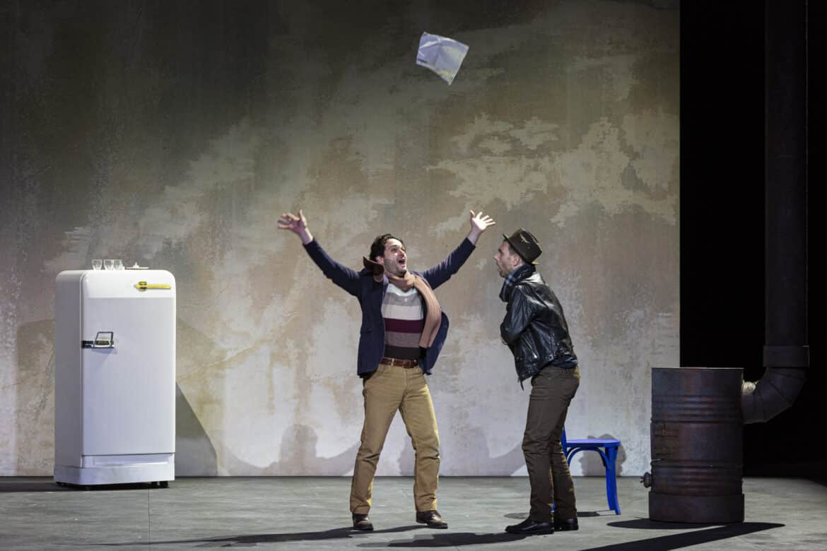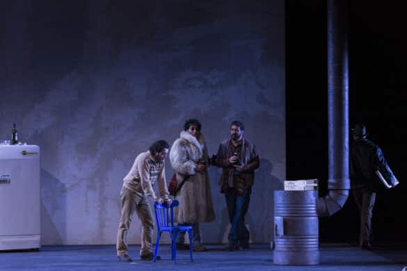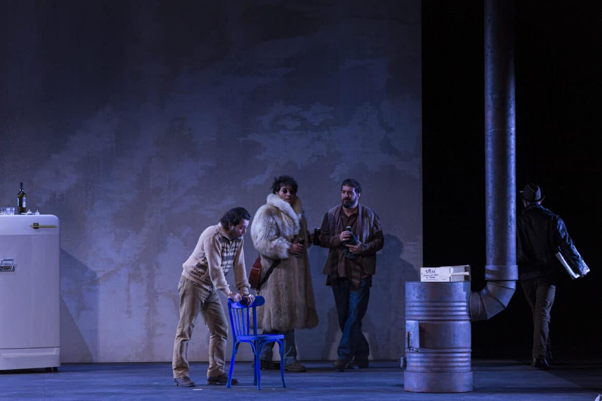 Sur le papier, La Bohème de Puccini est indiscutablement le titre idéal pour ce genre de projet durable : dans une dialectique où la forme rejoint le fond, la misère de la vie de bohème doit pouvoir être exprimée sur scène par une économie de moyens et une simplicité des effets. C’est très précisément le choix qu’opère Emmanuelle Bastet en réduisant la mansarde du premier acte à quelques accessoires saillants qui, chacun, font sens : un vieux canapé fatigué, un réfrigérateur désespérément vide, une chaise bancale et un poêle antédiluvien. Loin de déranger, la nudité du plateau constitue au contraire une métaphore pertinente de la difficulté de la vie d’artiste et permet de se concentrer sur le visage et la silhouette des protagonistes qui deviennent alors le lieu où s’accomplit le drame de la précarité.