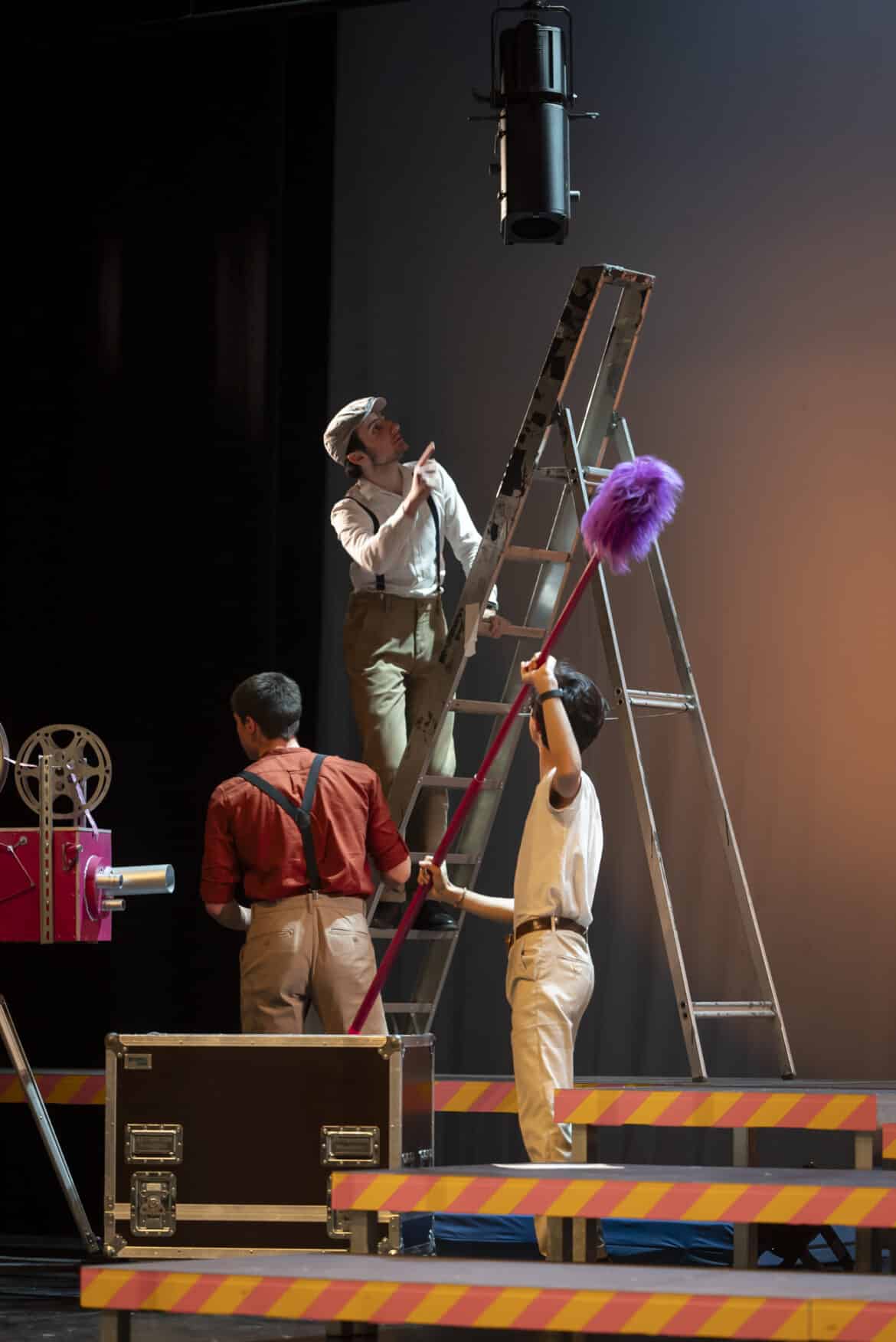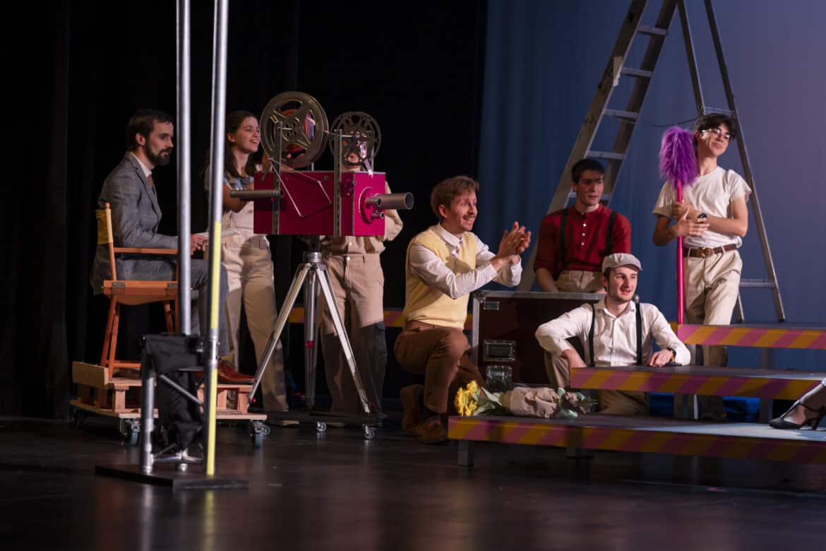 Hélène Lascombes, responsable de la mise en scène, de la scénographie et des costumes, propose un spectacle fort sympathique dont la qualité première ne réside pas selon nous dans la transposition proposée, un peu trop vue ces derniers temps sur diverses scènes françaises ou européennes : l’action se déroule en effet dans un studio de cinéma lors d’un tournage. Tantôt, le texte résiste à cette lecture (de qui, de quoi Pamina est-elle prisonnière ? Quelle est la finalité des épreuves qu’on fait passer aux héros ? Pourquoi Papageno, censé être le régisseur du studio, se demande-t-il constamment où il se trouve et quelles sont les personnes qu’il croise ?) ; tantôt cela donne lieu à d’heureuses trouvailles, telle la Reine de la Nuit devenue une actrice déchue du cinéma muet, supplantée par sa propre fille, nouvelle star naissante. Et surtout, le jeu d’acteurs est parfaitement efficace, y compris dans les scènes parlées, traduites en français et « modernisées » tout juste ce qu’il faut, sans les habituelles facilités (voire vulgarités) auxquelles cet exercice conduit trop souvent. Belle idée, notamment, que d’avoir fait de Papagena, lors de sa première apparition, non pas une femme vieille et laide, mais une jeune fille dont la beauté n’apparaît à Papageno qu’après coup, après avoir chaussé les lunettes de sa bien-aimée !