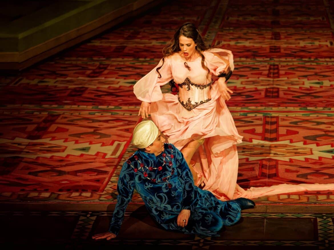 Pourtant, il reste deux images frappantes dans le troisième acte : celle du décor de la grande salle du palais voyant le plafond s’affaisser, semblant écraser les deux héros alors en proie au désespoir (« Oui, la mort va nous unir »). Enfin, la toute dernière image du spectacle fait regretter que l’ensemble n’ait pas eu ce niveau d’imagination et de poésie. Car on n’oubliera pas l’intervention du magnanime Bassa Sélim – Michel Fau lui-même – dans les airs, sur son tapis volant. Inénarrable.