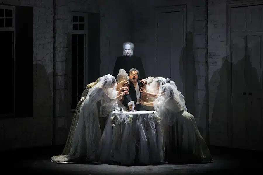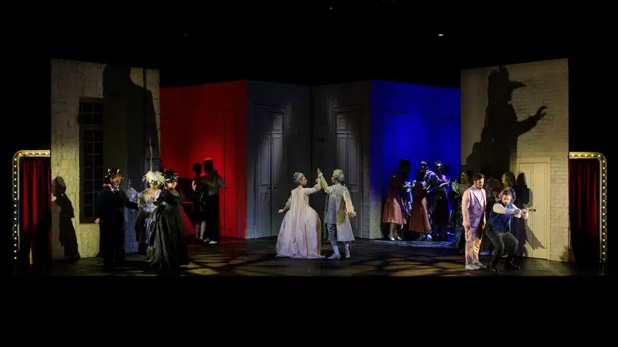 C’est peut-être l’opéra de Mozart qui a le plus stimulé les mises en scène les plus radicales : de celle « déconstruite » de Dmitrij Černjakov à Aix-en-Provence en 2010 à celle encore plus récente de Romeo Castellucci à Salzbourg en 2021, pleine de symboles pas toujours faciles à décrypter. C’est donc un défi à contre-courant pour Alessandro Talevi que de mettre en scène Don Giovanni dans des costumes du XVIIIe siècle. Ce metteur en scène, l’an dernier et toujours à Bologne, avait mis en scène Le nozze di Figaro à l’époque moderne et achèvera ici la trilogie de Da Ponte avec Così fan tutte. Mais cette mise en scène cache bien des surprises : lorsqu’après les premières scènes, de nouveaux personnages entrent en scène, les costumes seront XIXe siècle, puis, un peu plus tard, modernes !