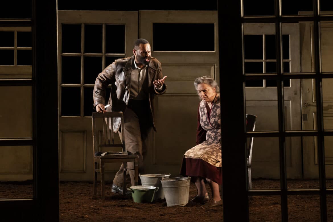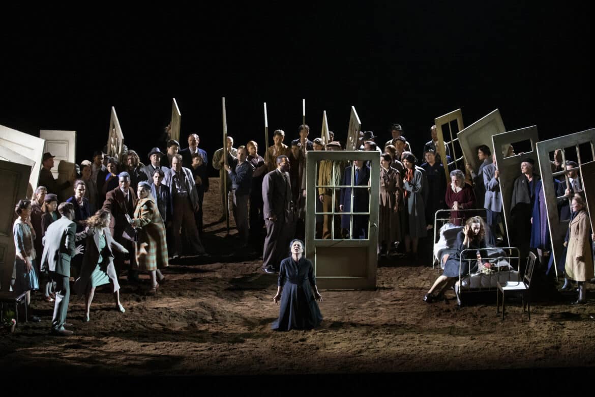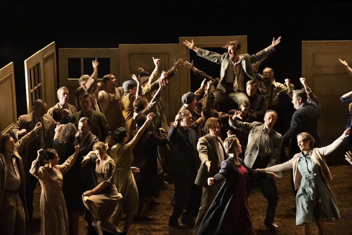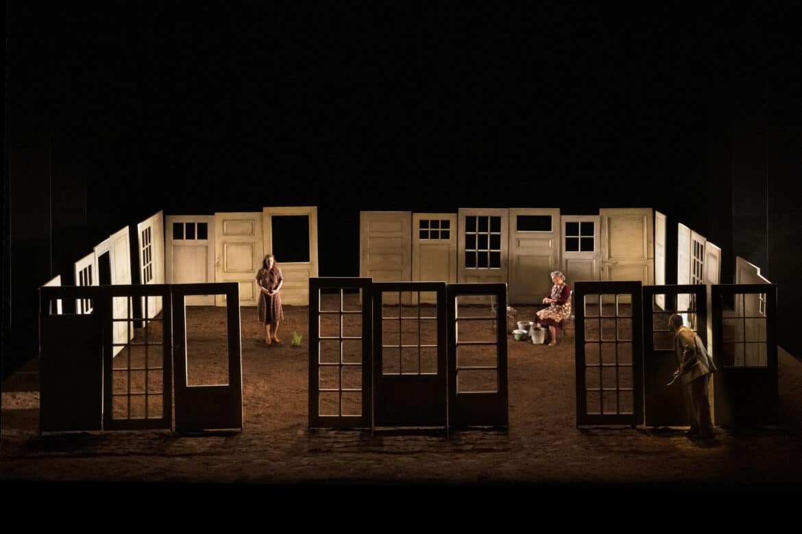 Retour en terres flamandes d’une production qui avait fait date fin 1999, au Vlaamse Opera de Gand : la première incursion du Canadien Robert Carsen dans l’univers de Janáček, compositeur auquel sa carrière l’associerait avec la même régularité que Britten et Puccini. On retrouve avec bonheur ce qui avait fait la force de cette lecture princeps : une poésie âpre, dépouillée, à l’image d’un décor réduit à sa plus simple expression – une série de portes plus ou moins ajourées, déplacées au gré des scènes par les choristes sur un plan incliné couvert de terre, métonymique du contexte rural de l’intrigue. Du moulin dans la montagne où se déroule l’action, nulle trace, hormis la cadence scandée par le xylophone pendant l’Ouverture.