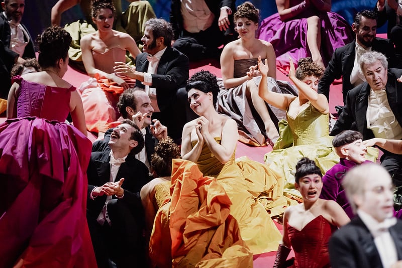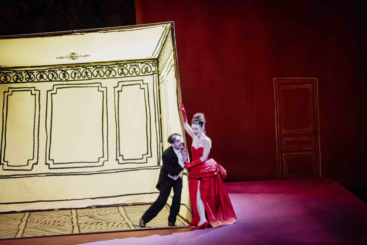 Le spectacle de Laurent Pelly met un peu de temps à se mettre en place en déconstruisant patiemment les faux-semblants bourgeois : pour cela, la scénographie épurée fait évoluer la structure étriquée dans laquelle évolue le couple volage, en lui donnant peu à peu des allures cubistes. Les murs éclatés symbolisent ainsi la liberté retrouvée des époux en mal de sensation, avant que la fête ne prenne corps dans l’énergie débridée des mouvements du chœur. Comme à son habitude, c’est dans le domaine de la direction d’acteurs que Laurent Pelly apporte ces petits détails savoureux qui donnent tant de crédibilité à la farce, avec un recours fréquent aux pantomimes. Particulièrement, on aime cette capacité à faire vivre cette folle soirée d’un réalisme encore si actuel, quand les vapeurs d’alcool font basculer les freins sociaux pour mieux délivrer les désirs, irrépressibles et sous-jacents, entre les sexes.
