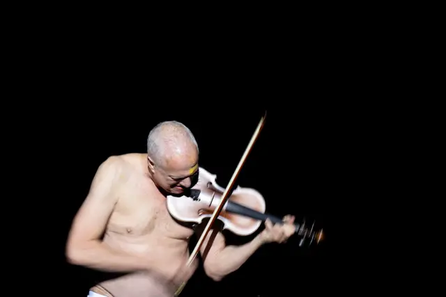 Accompagné dans la fosse par l’Ensemble intercontemporain dirigé par Pierre Bleuse, auquel s’ajoute un dijeroddo, un appeau (de canard semble-t-il), le roi – nommé ici « un homme » -– incarné par Johannes Martin Kränzle, apparaît dès la levée du rideau dans son plus simple appareil, avec seulement un slip blanc et quelques accessoires comme des strass et faux-cils sur le côté gauche du faciès, ou un fil de fer qui représente entre autres un serpent, symbole que l’on retrouve symétriquement à la fin de la soirée. Ces Eight Songs sont connus pour l’utilisation extrême de la voix, singeant le bruitisme des fous (voix hyper grave vs. sons de fausset, registres expressifs de la folie, etc.), ainsi que pour la forme ouverte présente dans sa partition. Le baryton Kränzle excelle dans ces vocalités non-classiques, au point qu’on se demande s’il est musicien ou comédien, dans la tradition des tréteaux. La liberté conférée à l’interprète est grande et la réussite tient en grande partie de sa présence scénique. Partant dans des soliloques invertébrés, il parle souvent aux bouvreuils représentés par des instruments différents. A la fin, il casse son violon (dont Kränzle joue d’ailleurs fort honnêtement) ; ce massacre est typique du rock de son époque. Au passage, parmi les modes et clichés actuels, ce spectacle partage avec Pelléas et Mélisande, donné au même moment à Aix : une chanteuse toute nue sur scène, la simulation pornographique de l’acte sexuel…