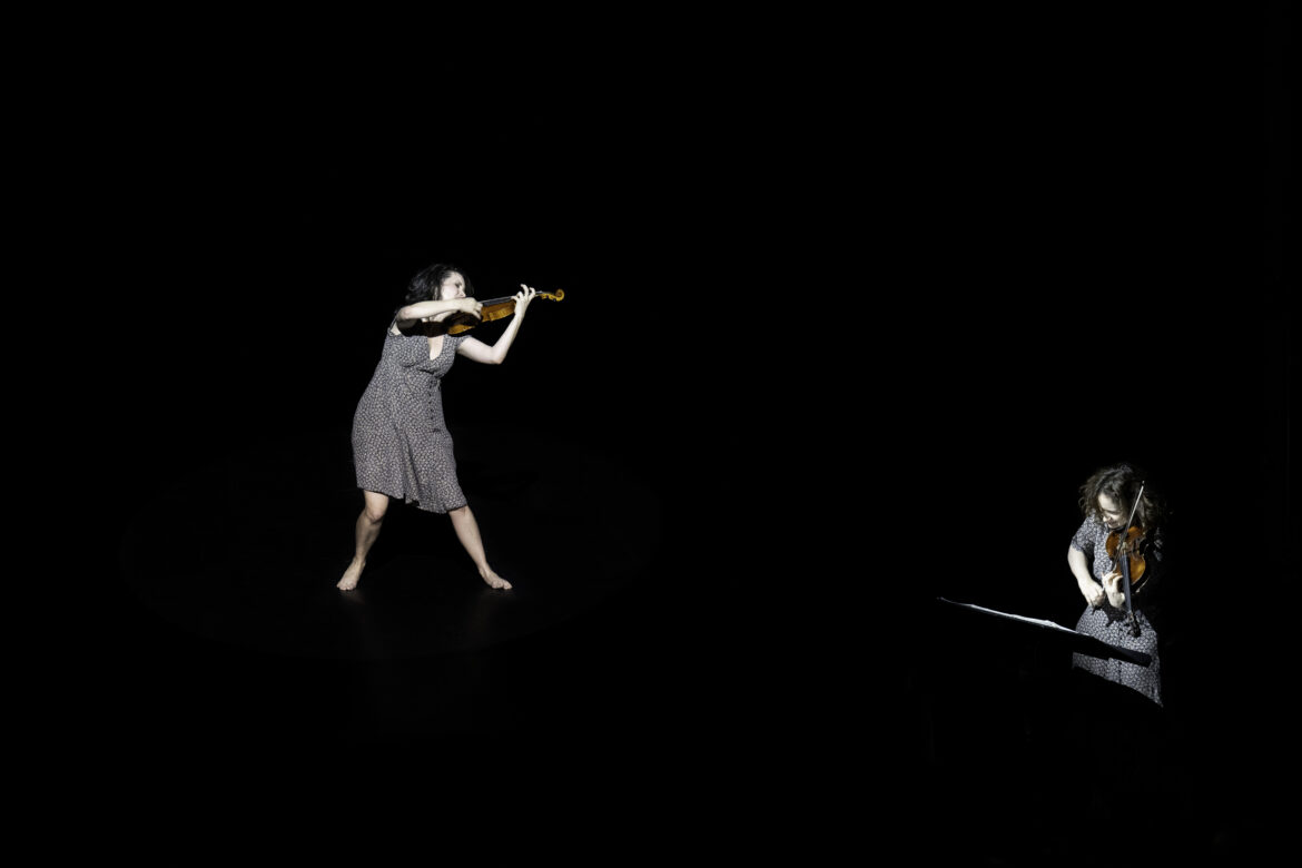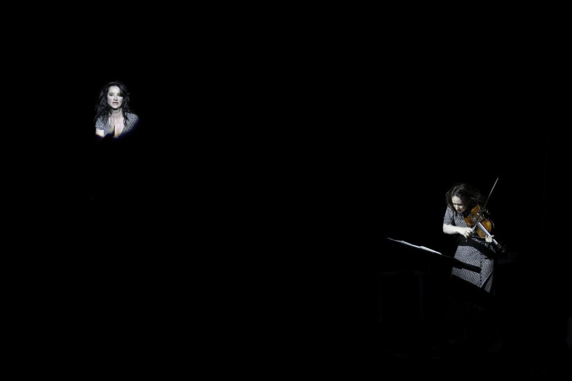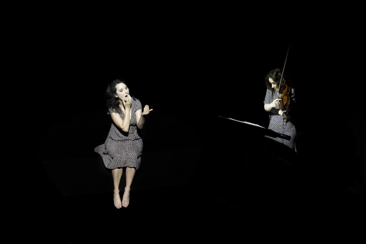 La soirée de poursuit avec les Kafka-Fragmente pour soprano et violon de György Kurtág, sur des textes de Franz Kafka. Cette fois c’est « une femme », incarnée par Anna Prohaska, qui mime des marches et démarches variées, « Comme un chemin en automne : à peine l’a-t-on balayé, qu’il se recouvre de feuilles mortes » (I.2). Elle est debout, allongée, hurlant, murmurant, etc. Sur scène, une seule violoniste, derrière son pupitre, sur le côté : ses modes de jeu et figures sonores sont d’une diversité inouïe ; ils soutiennent de façon souvent figuraliste les propos et les inflexions vocales. Hormis quelques aigus, toujours bien placés, mais peu timbrés, l’ensemble de la voix d’Anna Prohaska est impressionnant de variété et de justesse, au sens moderne du terme. Elle module l’intimité du journal personnel de Kafka, aux accents hétéroclites : parfois criés « sans répit » (I.4.), en berceuse ou en lyrisme : « …ce fut une très longue histoire d’amour… » (IV.2.) ; avec des effets théâtraux saisissants : « les spectateurs se figent quand le train passe devant eux. » (I.10.) Parfois, ce sont des maximes et jeux d’esprit suscitant les sourires du public : « Sur la canne de Balzac : je brise tous les obstacles. Sur la mienne : tous les obstacles me brisent… » (I.15), ou des vérités philosophiques : « Il n’existe pas d’Avoir, juste un Être » (III.1) brusquement confrontées au « coït comme punition… » (III. 2).