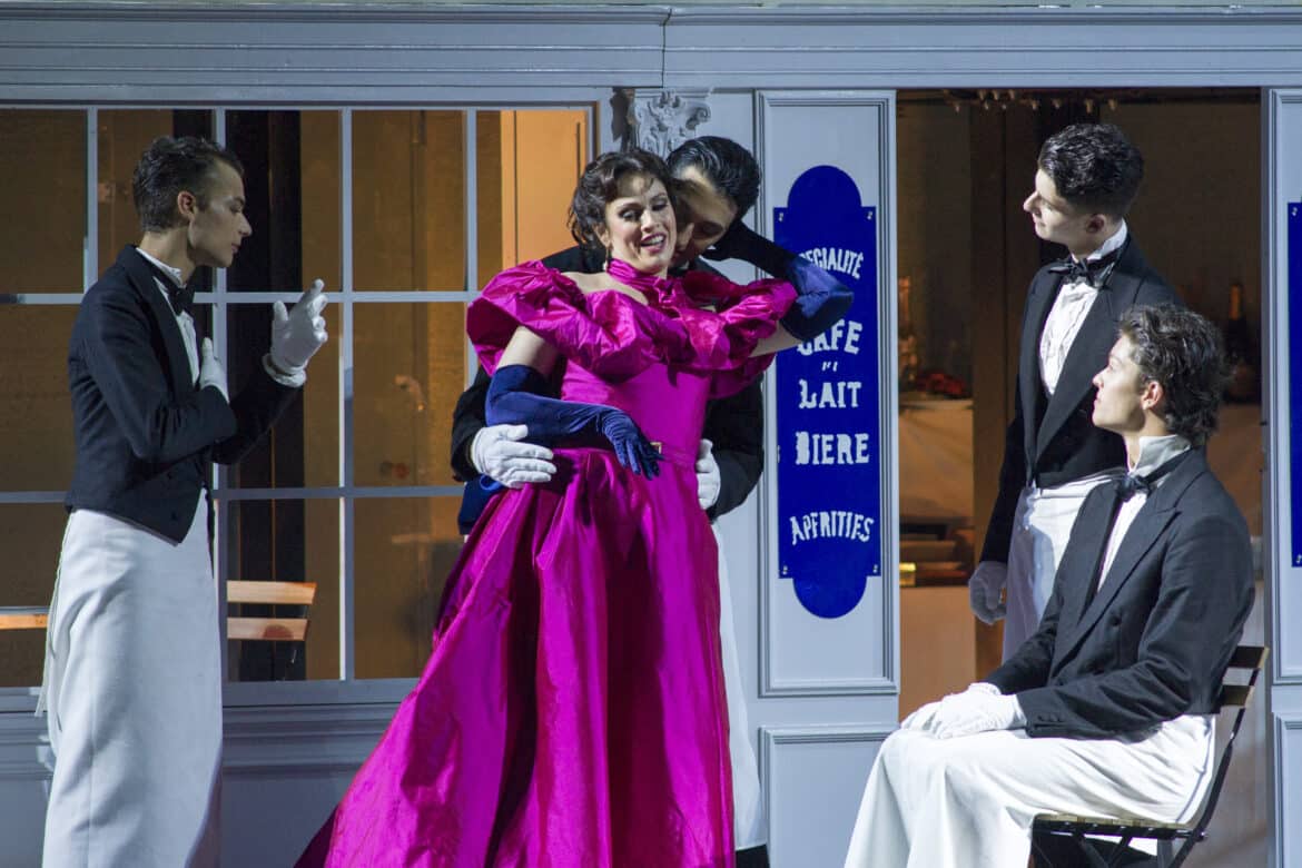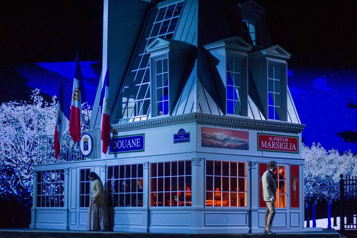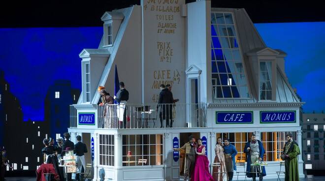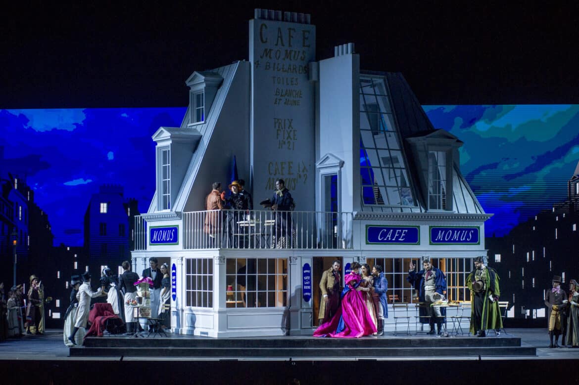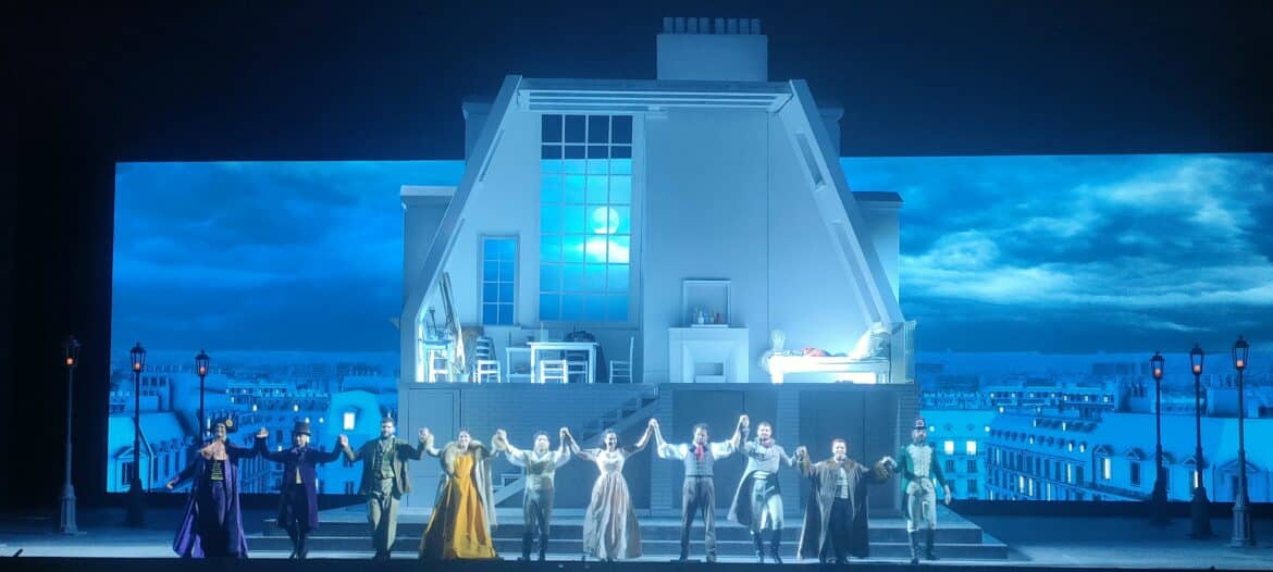 L’an dernier, le metteur en scène Christophe Gayral avait choisi de transposer (très sagement…) l’action de La bohème en mai 68, ce qui avait attiré la colère du chef Alberto Veronesi qui avait choisi de diriger les yeux bandés pour ne pas être confronté visuellement à tant d’ “horreurs” – ce qui avait suscité de nombreux lazzi chez les spectateurs ! Cet été, le Festival a passé commande d’une nouvelle production à Massimo Gasparon : aucun risque, cette fois-ci, d’encourir les foudres de celles et ceux qui ne supportent pas le moindre pas de côté par rapport à ce que dit le livret : nous sommes bien à Paris, en 1830, dans une mansarde, au café Momus puis à la Barrière d’Enfer. Rien ne manque : ni les bougies du premier tableau, ni le manchon, ni le bonnet rose de Mimi – et les costumes sont parfaitement fidèles aux costumes que portaient Parisiennes et Parisiens en ce début de XIXe siècle. On cherchera en vain une lecture (encore moins une relecture) dans cette mise en scène – qui est avant tout une mise en images fidèle du livret. Mais on reconnaîtra l’efficacité du dispositif scénique, très sobre (un décor central pivotant permettant de beaux changements à vue, tel celui servant de transition entre les deux premiers tableaux), que viennent rehausser d’élégantes projections figurant des vues du Paris de l’époque.