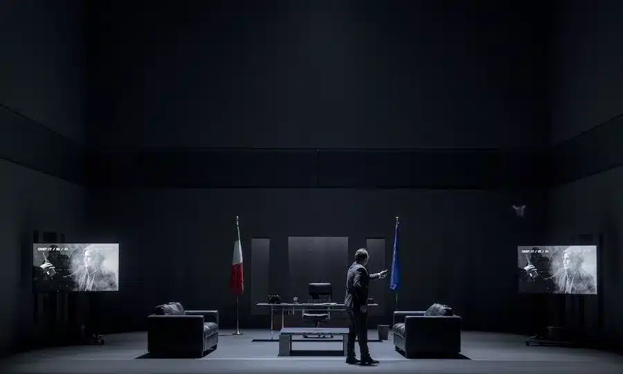 La mise en scène de Robert Carsen se concentre sur l’élément de pouvoir comme moteur imparable de l’histoire, en situant l’histoire dans les lieux de pouvoir de notre monde contemporain : le Sénat, les salles et les couloirs où les décisions sont prises. Les décors de Gideon Davey, qui a également conçu les costumes, sont gris foncé – le même gris que le proscenium et les murs de la salle de théâtre, intégrant ainsi idéalement les spectateurs dans l’histoire, avec une galerie permettant au public d’assister aux actes politiques. Sesto et Annio ne sont pas des rôles travestis, ce sont des femmes à part entière, même en pantalon. Dans la fluidité des genres, aujourd’hui comme au XVIIIe siècle, le fait que Vitellia cède aux pulsions de Sextus-femme, comme Servilia à celles d’Annio-femme, ne suscite guère d’émoi.