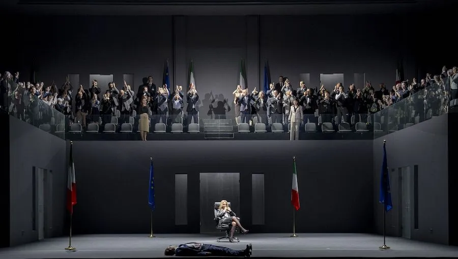 Le point culminant de l’histoire est le moment de l’attaque du Capitole et de la tentative d’assassinat de Titus : si en 1791 les spectateurs y voyaient les événements récents de la Révolution française, ceux d’aujourd’hui ne peuvent s’empêcher de faire référence à l’assaut du Capitole de janvier 2021, lorsque les partisans de Trump ont fait irruption dans les couloirs du Congrès américain. Ce sont en effet les images de cet assaut que nous voyons projetées, et dans cette foule se trouve Sextus tendant sa dague pour assassiner Titus, poussé par son amour pour Vitellia. Un extrait de cette scène révélera à l’empereur la trahison de son ami. Aucun puissant n’est à l’abri, et la démocratie aujourd’hui menacée ne l’est pas non plus : « Je crois que pour quelqu’un comme Titus – qui est un véritable humaniste – il est très difficile de survivre dans le climat politique actuel », écrit le metteur en scène dans le programme, « nous devons reconnaître avec étonnement que toutes les horreurs du XXe siècle n’ont pas pu empêcher des sociétés entières de revenir à des attitudes d’intolérance, de division et à une volonté de recourir à la violence. Notre spectacle se déroule dans une sorte de parlement, et ostensiblement dans un système démocratique. Mais je voulais rendre tangible la menace actuelle que représentent les partis d’extrême droite dans différents pays démocratiques, des partis qui adoptent des positions de plus en plus extrêmes, qui envahissent toutes les sphères de la vie sociale et qui, s’ils ne sont pas déjà au pouvoir, cherchent à le prendre le plus rapidement possible. Et lorsqu’il s’agit de se débarrasser d’opposants politiques, ils n’hésitent pas à utiliser toutes les méthodes qu’ils jugent nécessaires ». Le finale, dans la mise en scène de Carsen, est amer : après s’être débarrassée de Sextus, Annius et Servilia, Vitellia s’empare du pouvoir grâce aussi aux intrigues cachées de Publius. Triomphante, à ses pieds gît le cadavre de Titus assassiné.