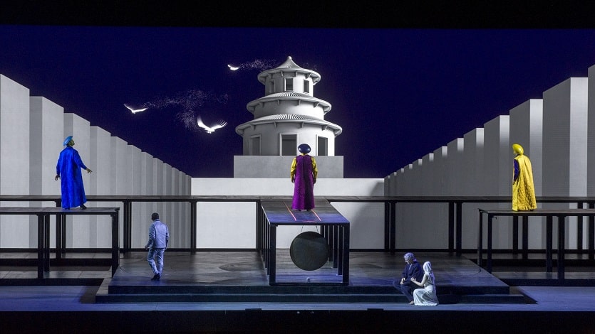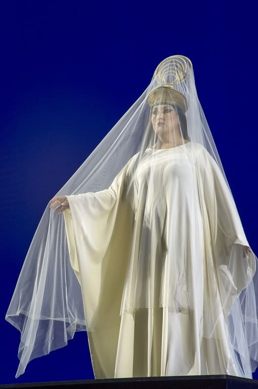 Après la sobriété d’une Tosca certes efficace mais que nous jugions dans ces mêmes colonnes « un peu trop sage », rien ne laissait présager la très belle réussite de cette Turandot, quatrième opéra mis en scène cette année par Pier Luigi Pizzi. Une fois encore, la scénographie est très dépouillée (elle ne comporte guère que quelques praticables mobiles), mais les projections d’images fixes ou (sobrement) animées (signées Matteo Letizi) donnent cette fois-ci une dimension éclatante, qu’il s’agisse de fonds lumineux colorés façon Bob Wilson, d’une évocation stylisée de la Cité impériale, d’un ciel nocturne où se dévoile progressivement une lune blanche, ou du vol d’oiseaux tournoyant dans le ciel – une image qui gagne encore en poésie quand de véritables oiseaux choisissent à leur tour de passer devant l’écran ! Rehaussée par de splendides costumes (eux aussi signés Pizzi), la direction d’acteurs se révèle d’une belle efficacité, particulièrement dans la scène finale, celle de la mort de Liù. Car comme à la création de l’œuvre en avril 1926 à la Scala, la représentation s’achève sur le suicide de la jeune esclave (voyez ici notre dossier consacré à l’œuvre). Pas de happy end, donc : l’œuvre se pare d’une teneur tragique inédite, et Liù, de personnage important, devient presque le personnage principal, donnant son sens au conte, apportant véritablement à Turandot la possibilité d’aimer – mais dans des conditions trop tragiques pour que quiconque puisse s’en réjouir. La procession funèbre, lente, glaçante, qui se prolonge bien après que la musique de Puccini se soit tue et que ferme la princesse Turandot elle-même, comme bouleversée par les événements tragiques auxquels elle vient d’assister, clôt un spectacle visuellement magnifique – avec peut-être un second acte un peu plus plat (la scène des énigmes) que ce que font voir des actes I et III particulièrement réussis.