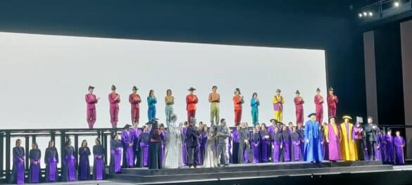 Liù, précisément, est chantée par une soprano, Chunxi Hu, que nous ne connaissions pas – et qui crée la surprise : le chant est admirablement contrôlé, avec un sens accompli des nuances (bel aigu pianissimo qui s’enfle progressivement à la fin de « Signore, ascolta ») et du legato. L’incarnation est par ailleurs très touchante, et vaudra à la jeune artiste un grand succès amplement mérité. Calaf est, comme l’été dernier, chanté par le ténor Amadi Lagha. On retrouve le timbre clair, l’émission haute qui caractérisent le chant du ténor franco-tunisien, ainsi qu’une belle assurance dans le registre aigu. Dès le deuxième acte, cependant, la voix accuse une certaine fatigue (qui n’empêchera pas pourtant le ténor de conclure son « Nessun dorma », au troisième acte, par un aigu très assuré !) : dans ces conditions, la suppression du très éprouvant duo final composé par Alfano a sans doute été la bienvenue… Le trio des ministres Ping, Pang (Saviero Pugliese) et Pong (Luigi Morassi) s’est révélé parfaitement équilibré, avec notamment un Ping de grand luxe en la personne de Pietro Spagnoli, qui interprète également le Mandarin. Le sobre Timur d’Andrea Concetti complète cette belle distribution. Curieuse idée en revanche d’avoir confié le rôle d’Altoum à un contre-ténor : si Danilo Pastore est audible dans sa première scène, sa voix est fatalement couverte par l’orchestre dans son échange avec sa fille après la scène des énigmes. (Pour rappel le créateur du rôle, Francesco Dominici, avait à son répertoire les rôles de Fernando dans La Favorite, Prunier dans La rondine ou Rodolfo dans La bohème !) Mais après tout, après le choix d’une « Altoumesse » mezzo à Bruxelles en juin dernier (pour lutter contre le patriarcat…), tout semble possible.