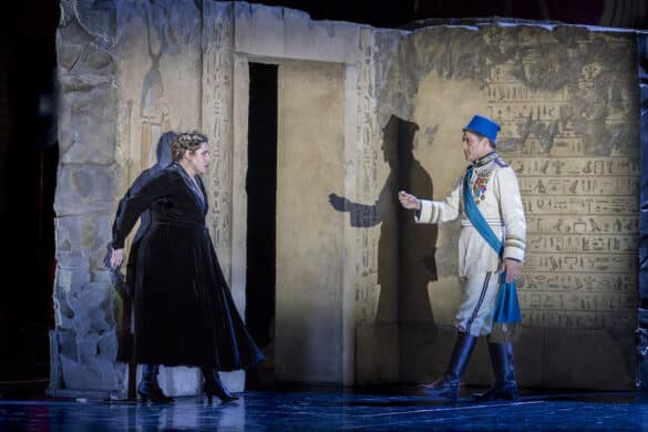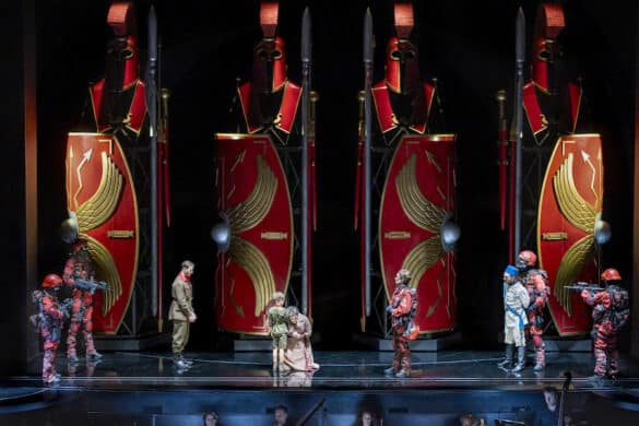 Dantone lui-même a souhaité que Leo Muscato, avec qui il avait travaillé à Turin sur L’incoronazione di Dario de Vivaldi, mette en scène sa « découverte ». Au metteur en scène de Martina Franca revient donc la tâche ingrate de conférer une dramaturgie à une œuvre qui n’en a pas, c’est pourquoi le résultat n’est pas tout à fait convaincant. Les costumes conçus par Giovanna Fiorentini révèlent l’époque du décor, celle des colonisations des XIXe et XXe siècles, tandis que la scénographie d’Andrea Belli propose pour la énième fois – un moratoire de dix ans devrait être imposé sur son utilisation… – l’habituelle plateforme tournante avec des ruines de casernes aux murs couverts de hiéroglyphes. Quatre énormes statues en laque rouge représentant des soldats en armure complètent la scène. Le jeu d’éclairage d’Alessandro Verazzi est extrêmement soigné, cherchant à diversifier les atmosphères. Les personnages entrent et sortent des diverses ouvertures comme s’ils jouaient à cache-cache… ce qui ne fait que souligner leur inaction.