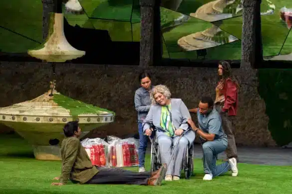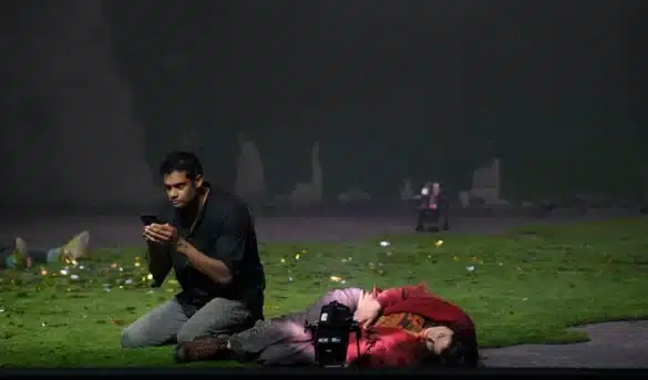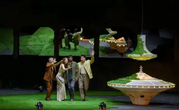 L’élément visuel du spectacle conçu par Peter Sellars est confié à l’ingénieux George Tsypin, qui transforme l’espace scénique de la Felsenreitschule en une salle de jeu (ressemblant plus à un Las Vegas halluciné d’aujourd’hui qu’au Roulettenburg de l’Allemagne de 1865), dont les roulettes s’élèvent et s’abaissent pour se changer en une flotte de vaisseaux spatiaux extraterrestres dignes des jeux vidéo d’antan, étincelants de lumières. Les taches de mousse qui recouvrent le sol, les arches en arrière-plan, mais aussi les « vaisseaux spatiaux » traduisant le sentiment d’irréalité tragique dans lequel l’histoire est plongée, apportent une touche d’aliénation supplémentaire : rarement la consonance entre la musique et l’aspect visuel n’a atteint un résultat aussi heureux que dans cette production. Peter Sellars, avec une habileté consommée, gère les parcours croisés d’un général russe endetté jusqu’au cou, d’une vieille femme riche mais bientôt démunie à cause de sa frénésie du jeu, de l’ambigu Marquis des Grieux, de la peu scrupuleuse Melle Blanche, de la belle-fille Polina et du précepteur Alexei Ivanovich. Tous sont dominés par la soif d’argent et la vanité, au point de sacrifier l’affection et l’amour. Les personnages sont des gens d’aujourd’hui, dans les vêtements contemporains de Camille Assaf, et ils se déplacent frénétiquement sur le vaste espace scénique, avec une belle fluidité et un humour savoureux.
