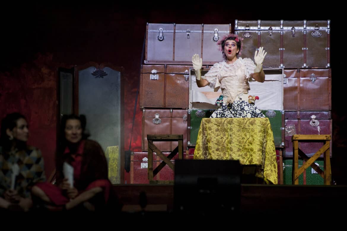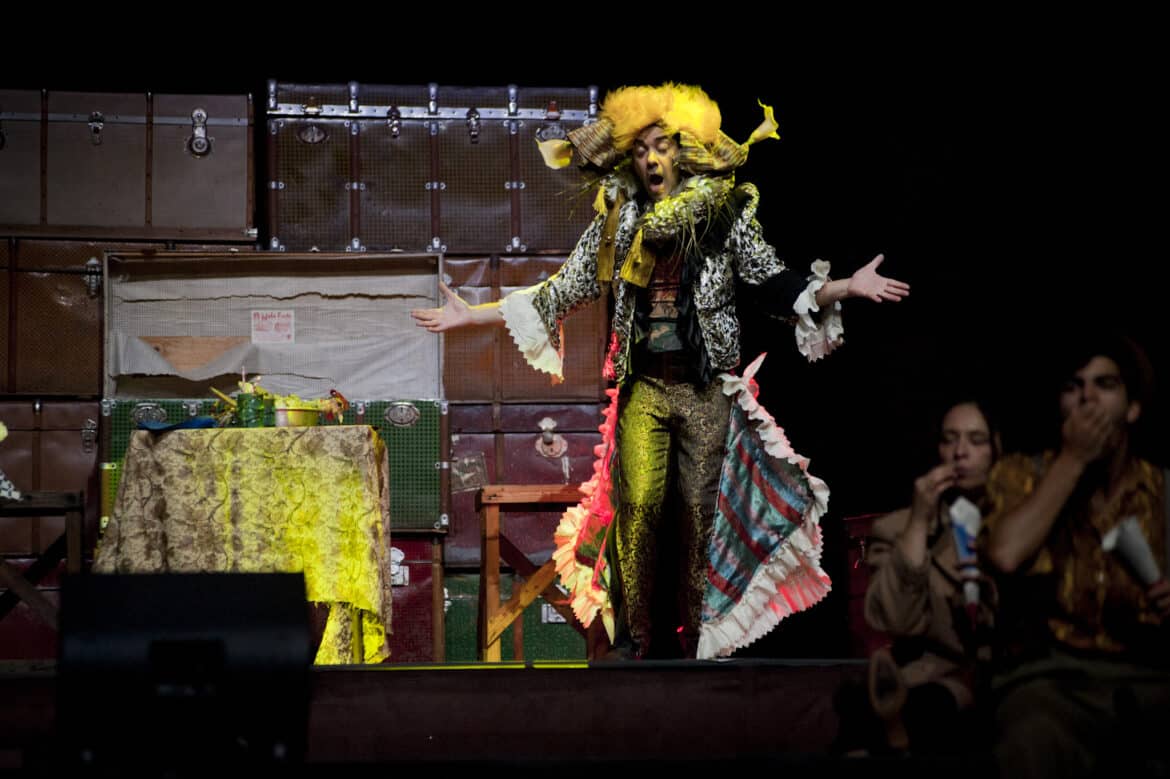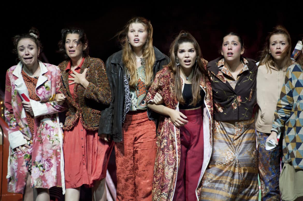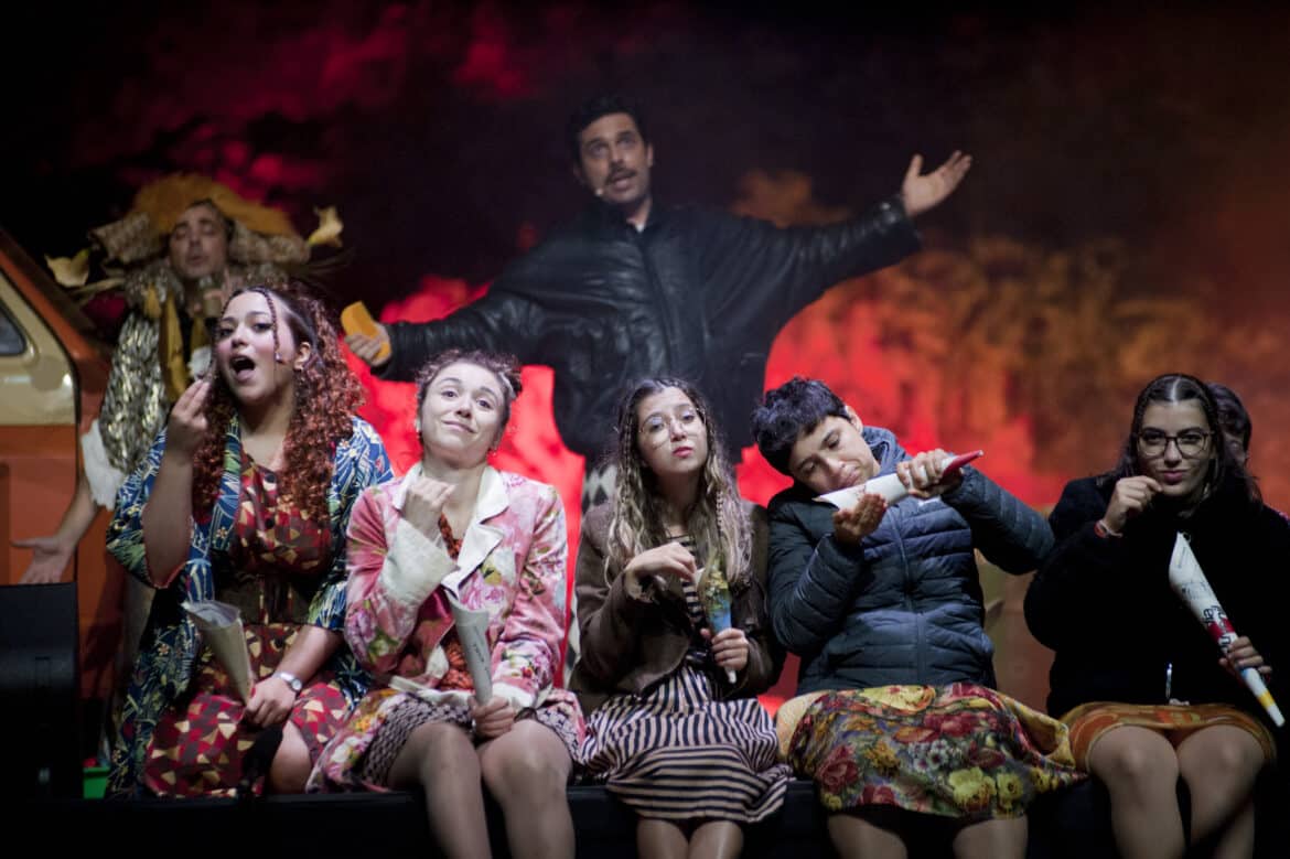 L’intensité dramatique et théâtrale monte encore d’un cran, mais dans un registre bouffe, avec un Pagliacci de haut vol, régal pour la voix et pour les yeux. Sur fond de Volkswagen Combi orange et d’un assemblage de malles-cabines, la scénographie de Patrícia Costa – splendides costumes bariolés, notamment – rejoint les fulgurances foutraques et poétiques d’un Kusturica ou d’un Fellini. Quant au chant, il partage la même séduction. Dès le Prologue, le baryton Jorge Martins place la barre très haut, happant le public en cinq minutes de monologue avec ce mélange de hâblerie et de rouerie. Catarina Molder montre une fois de plus que l’étendue de son registre théâtral – amoureuse éperdue avec Silvio, indifférente et cruelle avec Tonio mais aussi éclatante de verve clownesque – égale celle de ses moyens vocaux – son « Stridono lassù » est une merveille. L’élégance presque aristocratique du timbre de Rui Baeta n’empêche pas le beau duo entre Nedda et Silvio de vibrer de fièvre passionnée. Jorge Martins est un Tonio idéal, redoutable cousin de Iago affublé de la bosse d’un Richard III. Sa présence scénique et sa riche palette vocale font un sort à toutes les facettes de son personnage, aussi menaçant que pathétique. On retient du Beppe de Bruno Almeida sa belle sérénade à Colombine, et du Canio d’Andeka Gorrotxategi la parfaite maîtrise de l’arc dramatique conduisant son personnage (qu’il incarnait pour la seconde fois, après une prise de rôle à Malaga en 2022) de l’air bravache d’« Un tal gioco » au cri de révolte de « No, Pagliaccio non son », en passant par un « Vesti la giubba » bouleversant sans être racoleur. Mais pour nous, la réussite la plus éclatante de cette soirée est à mettre au crédit des chanteuses et chanteurs du chœur. Il est rare, lors d’une soirée d’opéra, de s’attarder sur la prestation – muette ou non – d’une de ces silhouettes que tant de metteurs en scène peinent à animer, et d’y trouver constamment matière à s’émouvoir. Or, par la magie de la direction de Mónica Garnel et de son assistante Anna Lepännen, pas un instant les choristes ne sont pris en défaut d’inexistence. Le meilleur exemple survient lors de la scène finale – le « théâtre dans le théâtre » – où la trentaine de choristes figurant le public, au lieu d’être relégués à l’arrière-plan, viennent prendre place au bord de la scène, tandis que Colombine et Arlequin jouent derrière eux. C’est alors un festival de micro-scènes ponctuées d’expressions hilarantes ou poignantes, en un moment étrange où spectateurs fictifs et spectateurs réels se font face. On pense aux enfants du Guignol dans Les Quatre Cents Coups de Truffaut… Ainsi une nouvelle dimension s’ajoute-t-elle à la mise en abyme voulue par Leoncavallo. Ainsi une soirée d’opéra se grave-t-elle pour toujours dans notre mémoire.