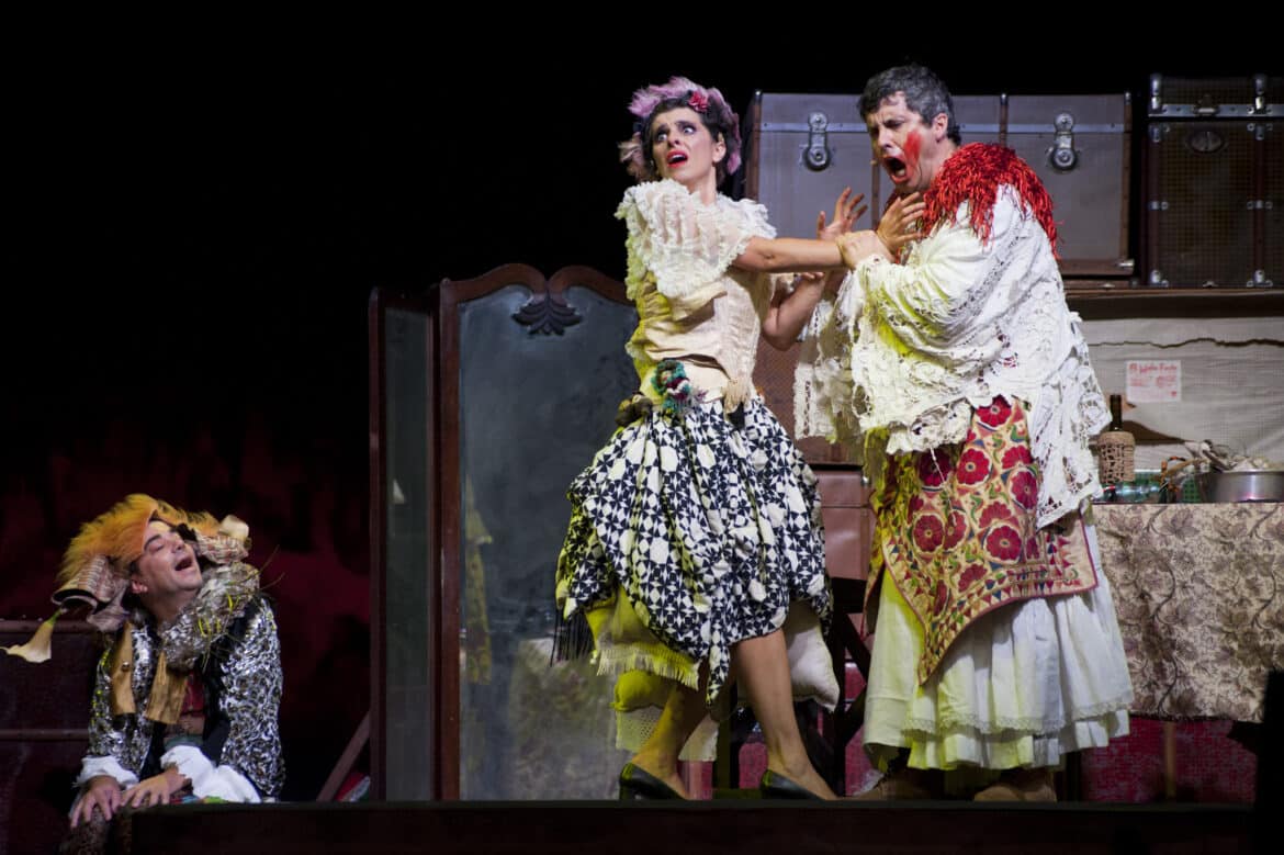 La suite relève d’une lecture plus classique, avec un plateau partagé entre la taverne de Mamma Lucia à gauche et la place du village à droite (l’église est figurée in absentia), et une alternance dans le surgissement des groupes – chœurs de villageois et villageoises, procession de Pâques avec ses pénitents – et des chanteurs solistes. Dans le rôle de Santuzza, la soprano Catarina Molder trouve un personnage à la mesure de son tempérament, oscillant de la tendresse meurtrie à la colère explosive, de la fragilité amoureuse à la piété ombrageuse. Face à elle, Christian Luján campe un Alfio touchant en mâle alpha aux certitudes vacillantes, et leur duo est un des moments forts de la soirée, comme l’est en miroir inversé celui de la volage Lola (Leila Moreso), au mezzo provocant, avec Turiddu. Le ténor espagnol Andeka Gorrotxategi brosse un portrait nuancé de l’ancien soldat tiraillé entre la femme infidèle de son présent et l’amante fidèle de son passé. Dès la sérénade introductive – donnée non pas en coulisses mais sur un des balcons de la grotte -, la souplesse et les couleurs de son instrument séduisent, et sa présence scénique enlève avec brio la séquence alliant la chanson à boire à son affrontement avec Alfio. Témoin et confidente du drame, la Mamma Lucia de Carolina Figueiredo touche par son incarnation sans affèterie, simplement humaine. La direction d’orchestre d’Osvaldo Ferreira, tendue vers le drame, parvient à serrer le cœur dans l’Intermezzo et à glacer le sang dans la déflagration orchestrale conclusive.