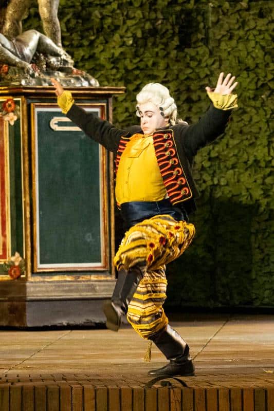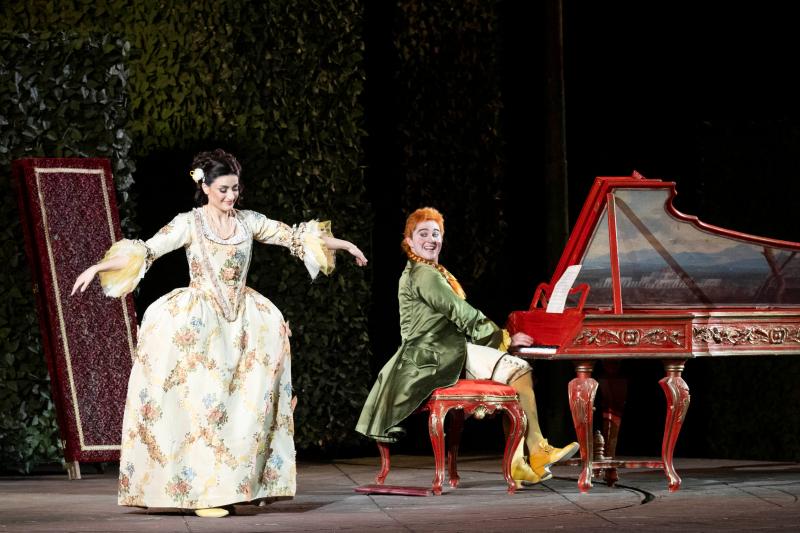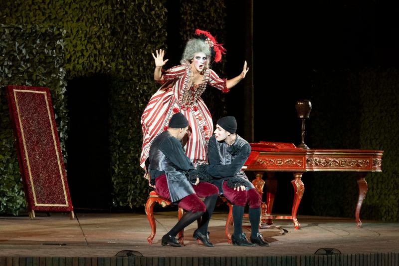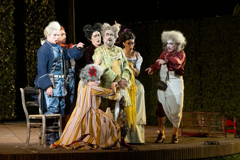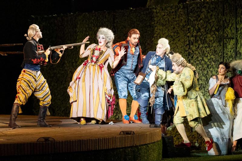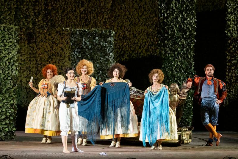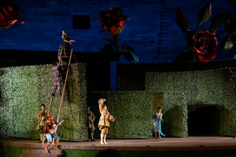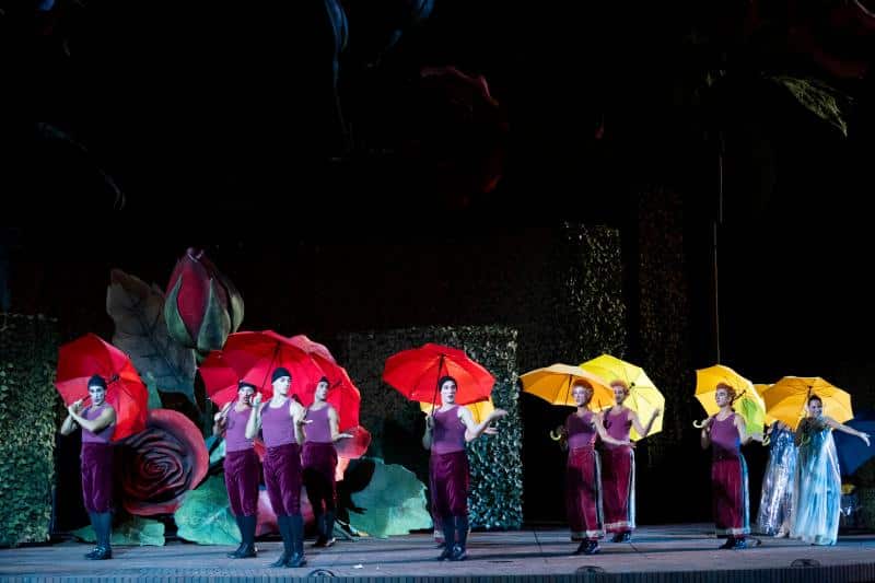 Au-delà des prestations de chaque chanteur, Il barbiere di Siviglia est aussi, et sans doute surtout, l’œuvre d’une équipe et dans ce sens-là, la représentation de ce soir est une belle réussite. Il s’agit de la sixième reprise de la mise en scène de Hugo De Ana, datant de 2007. Assez classiques, les décors, conçus par le réalisateur lui-même, ainsi que les costumes d’époque et les lumières, s’ouvrent sur un jardin en labyrinthe, orné de roses rouges géantes. Pendant l’ouverture, se dessine une pantomime (chorégraphie de Leda Lojodice) et, à en juger aux bravos qui s’ensuivent, le public est aussitôt conquis. Il le sera à nouveau lors de la scène d’orage, pendant laquelle défilent des parapluies de couleur. Enfin, grâce au feu d’artifice de clôture, scellant à tout jamais le lieto fine.