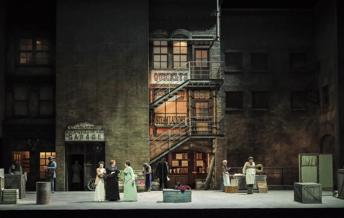 Vingt-cinq ans de bons et loyaux services, ce n’est pas rien et, comme le rappelle Dominique Pitoiset lui-même dans le programme de salle, lors d’un entretien accordé pour la reprise de 2017, nous assistons bien à une création du siècle dernier, répondant à une esthétique très éloignée de ce que l’on pourrait envisager actuellement. Ce spectacle ayant été programmé à maintes occasions, ne nous appesantissons pas sur un univers que connaît bien le public parisien, et plus largement tout amateur d’opéra itinérant, ayant pu faire étape dans la capitale au cours des trois dernières décennies. Rappelons seulement, toujours avec Dominique Pitoiset, qu’il s’agit d’« une production visuellement plus proche de Verdi que de Shakespeare », même si le metteur en scène n’oublie pas de convoquer ses propres réalisations shakespeariennes du théâtre de parole, de même que le Falstaff d’Orson Welles, remontant à 1965. Deux idées essentielles marquent sa conception : un décor de bâtiments industriels du tournant du XIXe siècle (Alexandre Beliaev), rappelant le film de Sergio Leone Once Upon a Time in America (Il était une fois en Amérique) de 1984 et l’identification de Ford en tant qu’homme politique en campagne électorale, ce qui se perçoit d’ailleurs surtout dans la dernière scène du parc de Windsor et plus particulièrement dans l’ultime fugue de l’épilogue. Les personnages y évoluent ainsi dans des beaux costumes Belle Époque (Elena Rivkina).