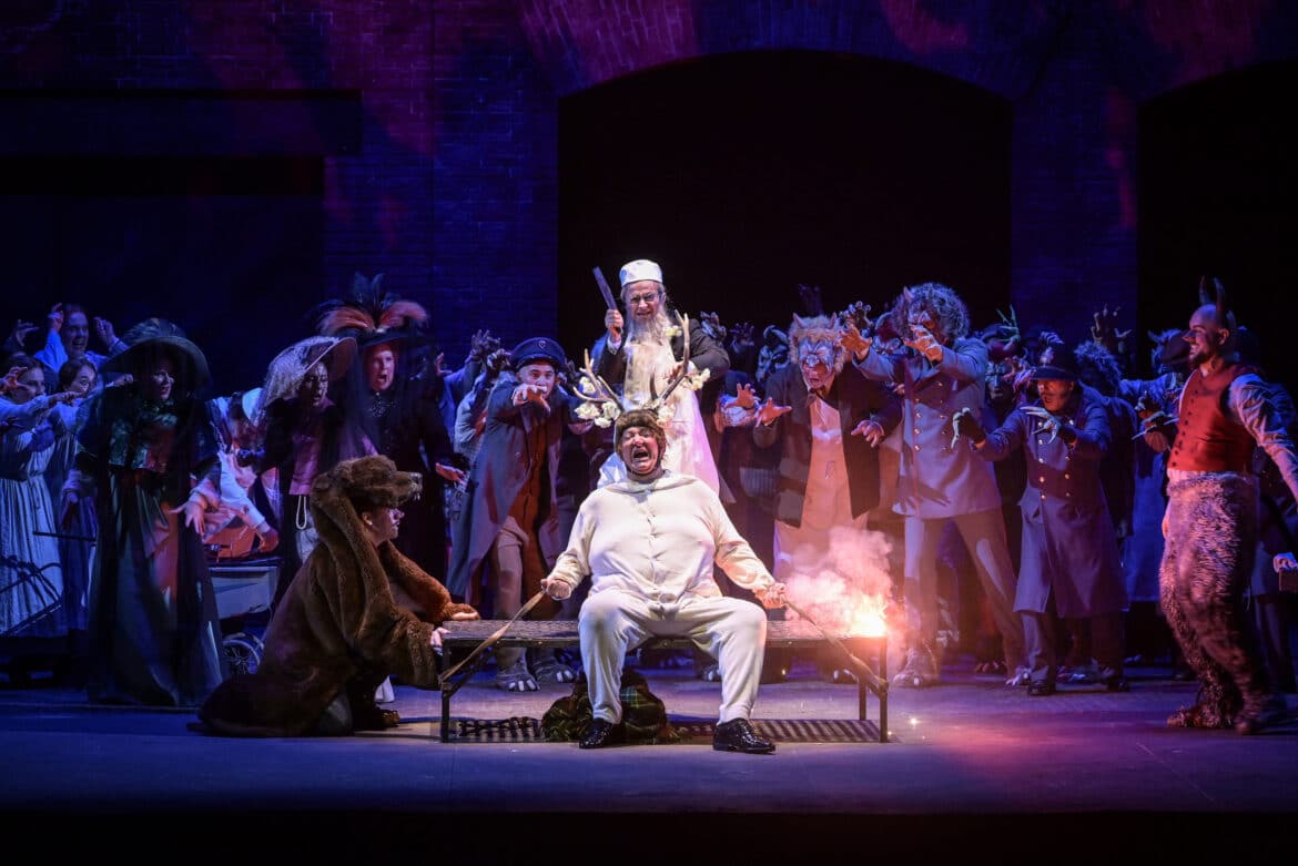 Après cette douche froide, les héros se retrouvent au troisième acte lors d’une réunion festive dans une forêt shakespearienne intime et enchantée, dont l’atmosphère ténébreuse est enrichie d’indispensables lanternes, d’habits de chasse et d’elfes caractéristiques de l’auteur anglais. Falstaff, que les invités amenés par M. Ford s’empressent de ridiculiser, apparaît comme un porteur de corne, victime des forces malveillantes qui envahissent la forêt. Dans ce décor, l’air de Fenton « Dal labbro il canto » a été interprété par Iván Ayon-Rivas avec une passion débordante, capable de susciter une réponse tout aussi poétique de la part de la Nannetta de Federica Guida en tant que Reine des fées, avec un étonnant « Sul fil d’un soffio etesio ». Le spectacle se referme sur une brillante interprétation du délicieux tutti final, dans lequel tous les personnages chantent sur le ton de la confession que « Tout, dans le monde, est une farce » (« Tutto nel mondo è burla ») !
