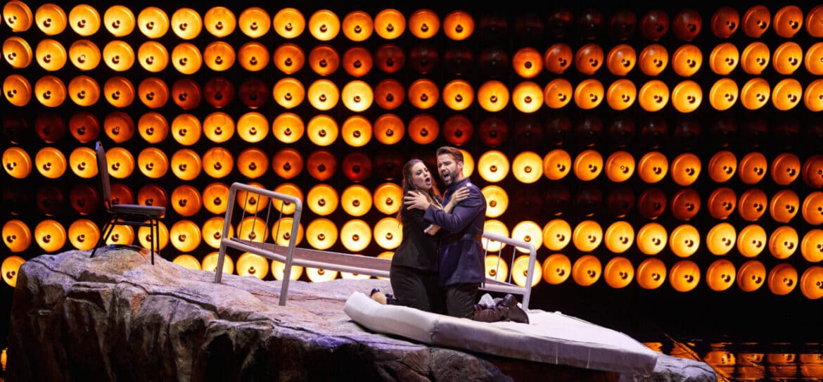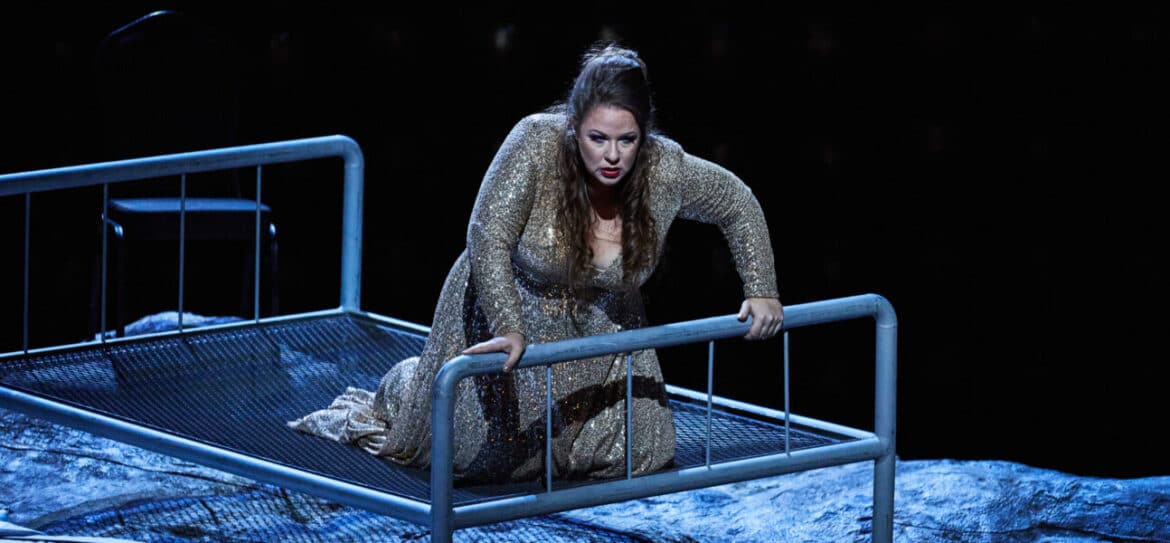 Que le rideau se lève sur Aïda et Radamès en train de faire l’amour sur un lit d’hôpital, pourquoi pas ?… Que ce même lit juché sur un tas de pierres tourne sur lui-même tout au long de ces 4 actes encadrés par des immenses échafaudages sur lesquels sont accrochés des phares de voiture, soit. Qu’Aïda soit habillée en soubrette sortie d’une pièce de Labiche , soit. Que les costumes mélangent treillis de la guerre de 14, smoking, robes longues, punk, soit. Que la marche triomphale d’Aïda soit remplacée par une pluie de billets de banque tombant des cintres soit encore ! Le seul problème est que tout ces procédés sont utilisé ad nauseam depuis des années, démontrant surtout le manque d’imagination, d’audace et d’originalité du metteur en scène Philipp Himmelmann.