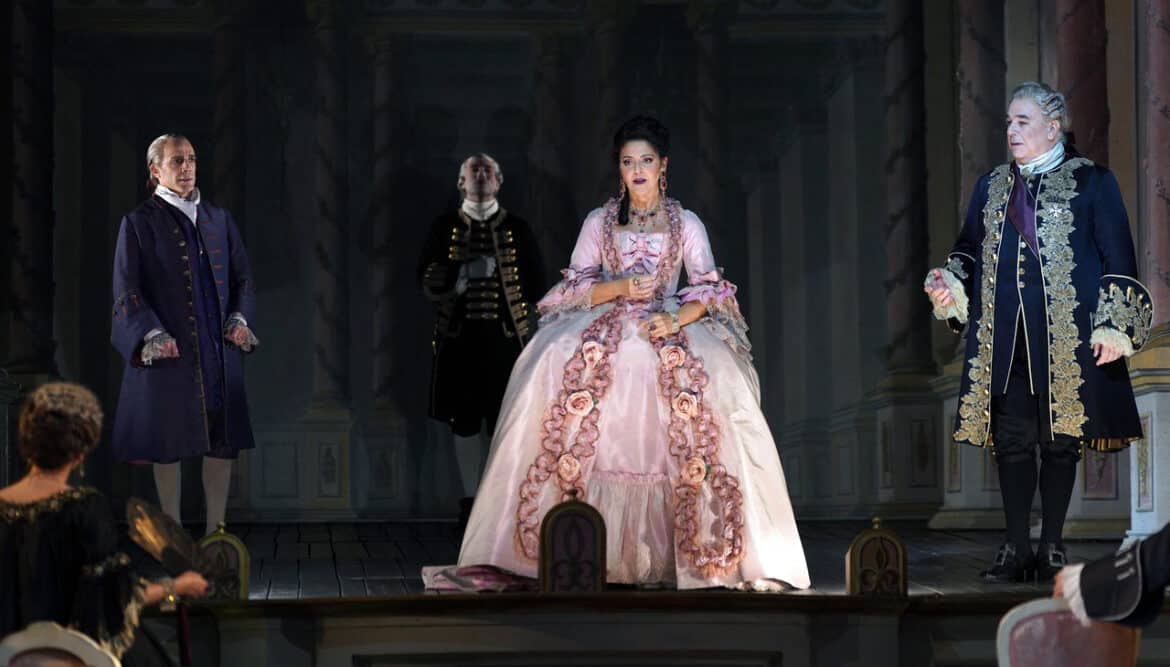 Dans un ouvrage de la période musicale improprement dénommée « vériste », il est fréquent de donner aux « petits » rôles de composition une scène les mettant particulièrement en évidence : dans Adriana Lecouvreur, c’est le cas à l’acte IV, avec ce quatuor des comédiens de la Maison de Molière qui doivent camper des figures parfaitement identifiables pour le spectateur. Au sein de deux distributions à ce point soignées, on n’est guère étonné d’entendre dans ces rôles des acteurs-chanteurs aussi bien campés que la Mademoiselle Jouvenot de Sylvia Schwartz, la Dangeville de Monica Bacelli, les Quinault et Poisson de David Lagares et Vicenç Esteve.