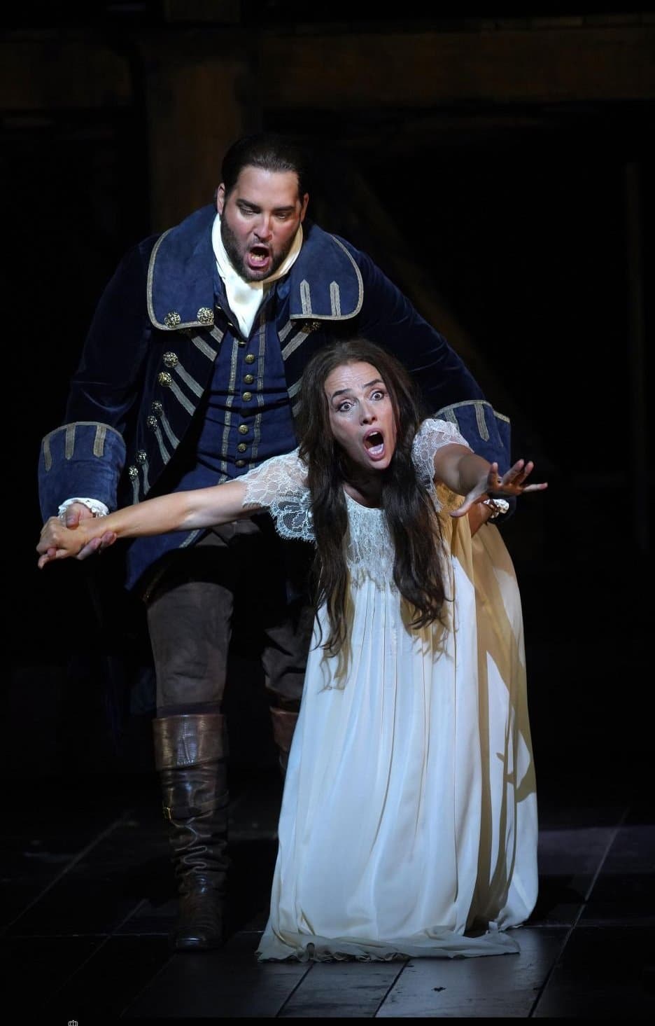Avec les deux interprètes de la princesse de Bouillon, la fièvre monte de plusieurs degrés : tout d’abord, parce qu’Elina Garança, glorieuse de santé vocale en ce soir du 29 septembre, trouve avec ce rôle l’une de ses incarnations les plus abouties. Dans ses duos et échanges avec Maurizio, au deuxième et troisième acte – le ténor Brian Jagde – comme dans ses affrontements mémorables avec Adriana – Ermonela Jaho dans le cast I – on a l’impression de voir évoluer sur scène, au hasard d’un geste de la main, d’un regard ou d’un mouvement d’éventail, la marquise de Merteuil des Liaisons dangereuses ! Dans un tout autre style, la mezzo russe Ksenia Dudnikova impressionne dès son entrée en scène avec un « Acerba voluta » hallucinant de puissance vocale. On est ici face à une voix immense, aux couleurs mordorées et aux graves abyssaux – mais jamais poitrinés ! – qui enivrent l’auditeur. Se mêlant avec bonheur aux couleurs vocales de l’Adriana de Maria Agresta et du Maurizio de Matthew Polenzani, l’interprète restitue parfaitement le côté tigresse que l’on aime à retrouver dans un emploi où plane toujours pour nous l’ombre d’une Fiorenza Cossotto…