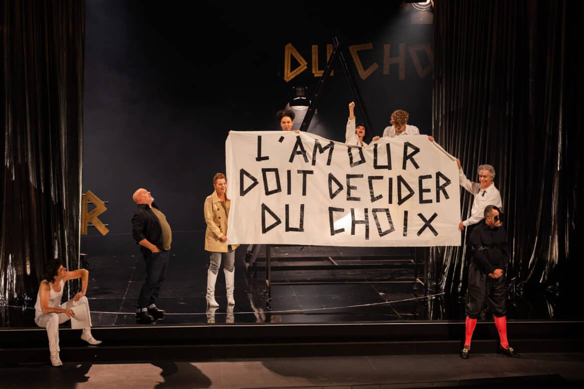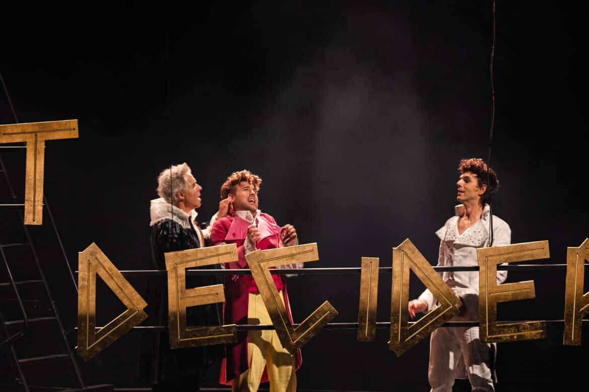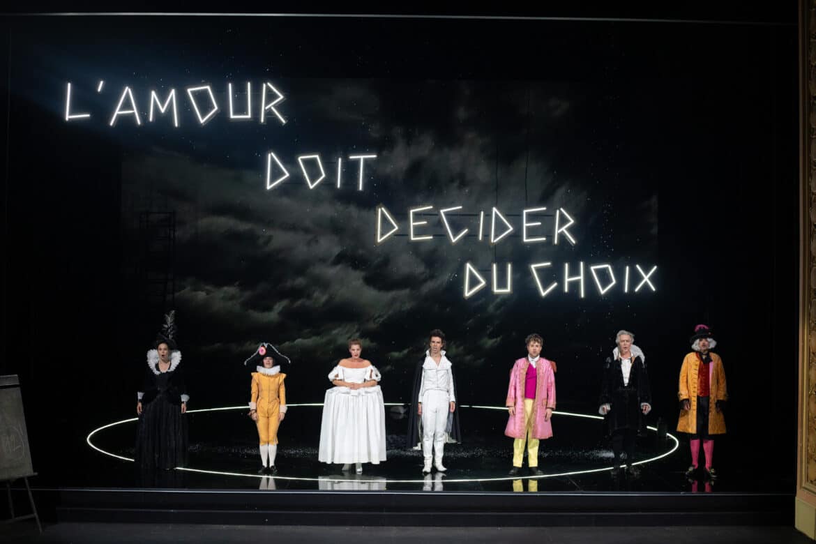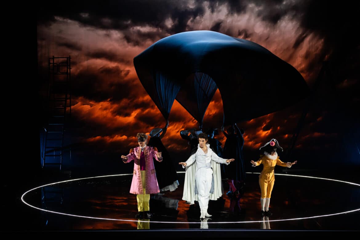 Sur le plan visuel, Jean Lacornerie opte pour un décor épuré et évocateur, utilisant des accessoires minimalistes tels que des nuages, des éclairs, une banderole, des échafaudages ou un tableau noir afin de souligner l’humour de la situation tout en maintenant l’attention sur les acteurs. Cette sobriété scénique met en lumière les interactions entre les personnages et l’énergie vive de leurs échanges. Le metteur en scène choisit ici un cadre qui alterne entre le respect des conventions classiques de l’opéra comique et une relecture contemporaine des personnages, notamment à travers les costumes de Marion Bénages. Ceux-ci marient des éléments d’époques variées : costumes inspirés du XVIIe siècle pour les personnages plus conservateurs, tenues XVIIIe pour les figures de la commedia dell’arte, et touches modernes pour les comédiens d’aujourd’hui. Ce jeu subtil sur les époques permet à l’œuvre de naviguer entre tradition et modernité, tout en respectant l’esprit du texte et de la musique. Les lumières de Kevin Briard apportent à l’ensemble une touche de poésie à l’inventivité remarquable, les chorégraphies au millimètre de Raphaël Cottin rehaussant le tout d’une espièglerie fort à propos.