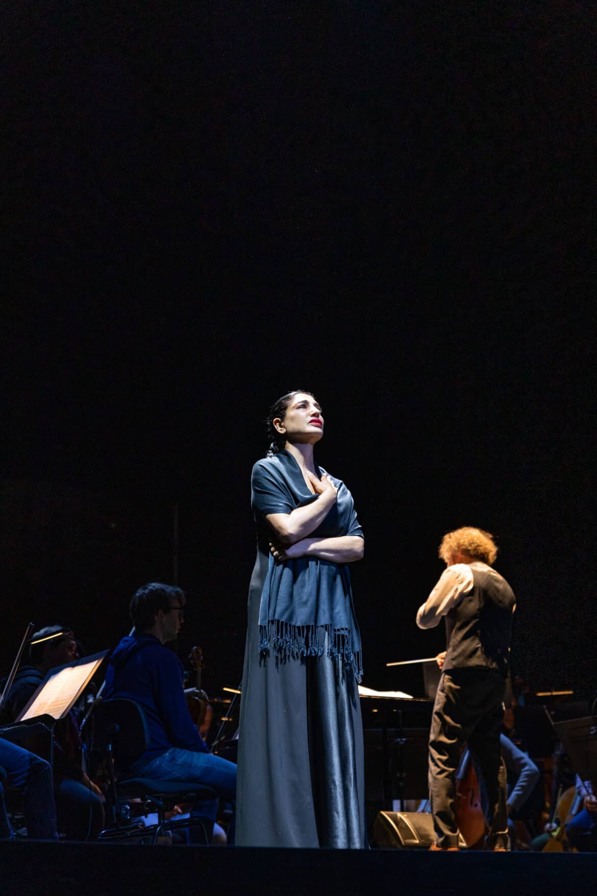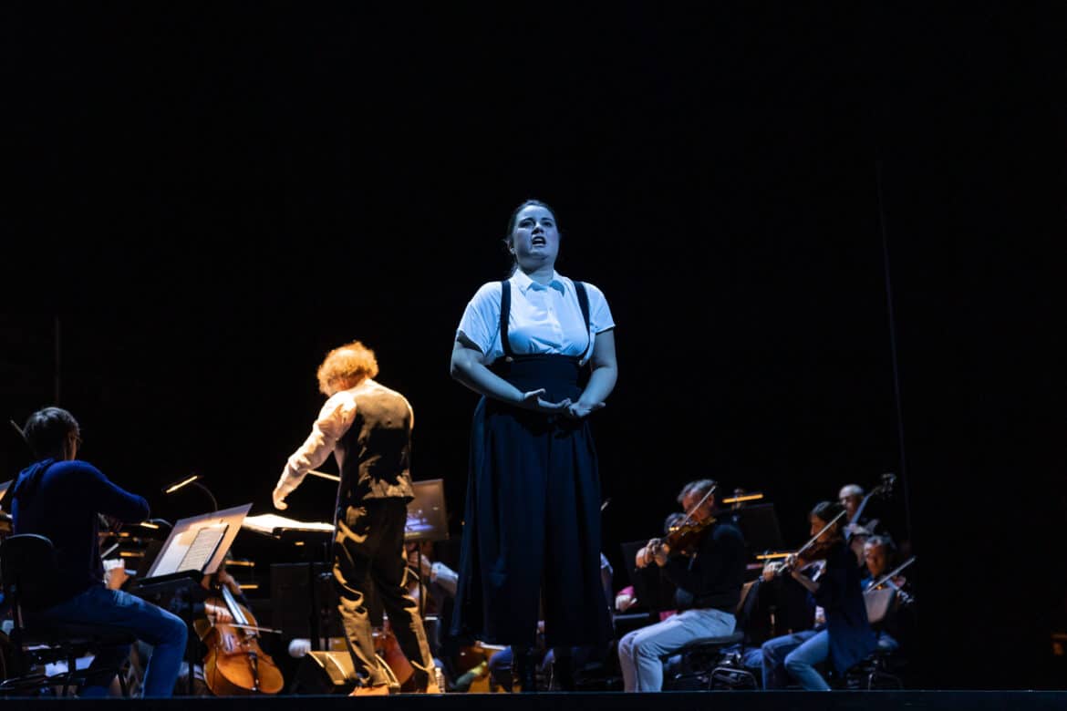 Sarah Schinasi assure une mise en espace simple mais efficace, où tout se déroule sur le devant de la scène. Or l’orchestre étant déployé derrière les chanteurs, aucun ne peut suivre le chef qu’ils ont dans le dos. Tous chantent par cœur. Chacun s’adapte avec efficacité et rares sont les décalages tant le professionnalisme des musiciens est évident. Si le chœur montre des moments de faiblesse par manque d’homogénéité et quelques stridences, l’Orchestre national des Pays de la Loire montre de réelles qualités dans une partition que toutes et tous découvraient deux jours auparavant seulement. Le peu de temps de répétition pour trouver les dosages et couleurs souhaités n’empêcha pas une exécution soignée, malgré la direction musicale parfois flottante de Mario Manicagli, aux gestes plus amples que précis. Reste que les grands moments dramatiques étaient efficaces, tout comme les rares temps d’intimité.