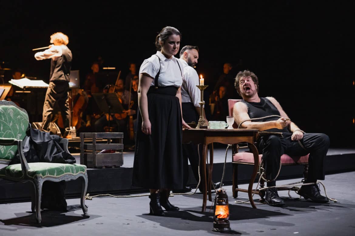 Ajoutez-y un soldat idéaliste (personnifiant le vrai Jullien) broyé par la violence aveugle, une histoire d’amour entre Mariella, une fille du peuple, et un aristocrate rien moins que prince, se faisant connaitre comme le petit Marat afin de tromper l’Ogre et pouvoir libérer sa mère de la prison où elle croupit avant son exécution. Voilà pour l’intrigue, que les deuxième et troisième actes creusent de façon particulièrement dramatique, très sombre et parfois originale dans ce discours durchkomponiert et dans l’emploi des instruments.