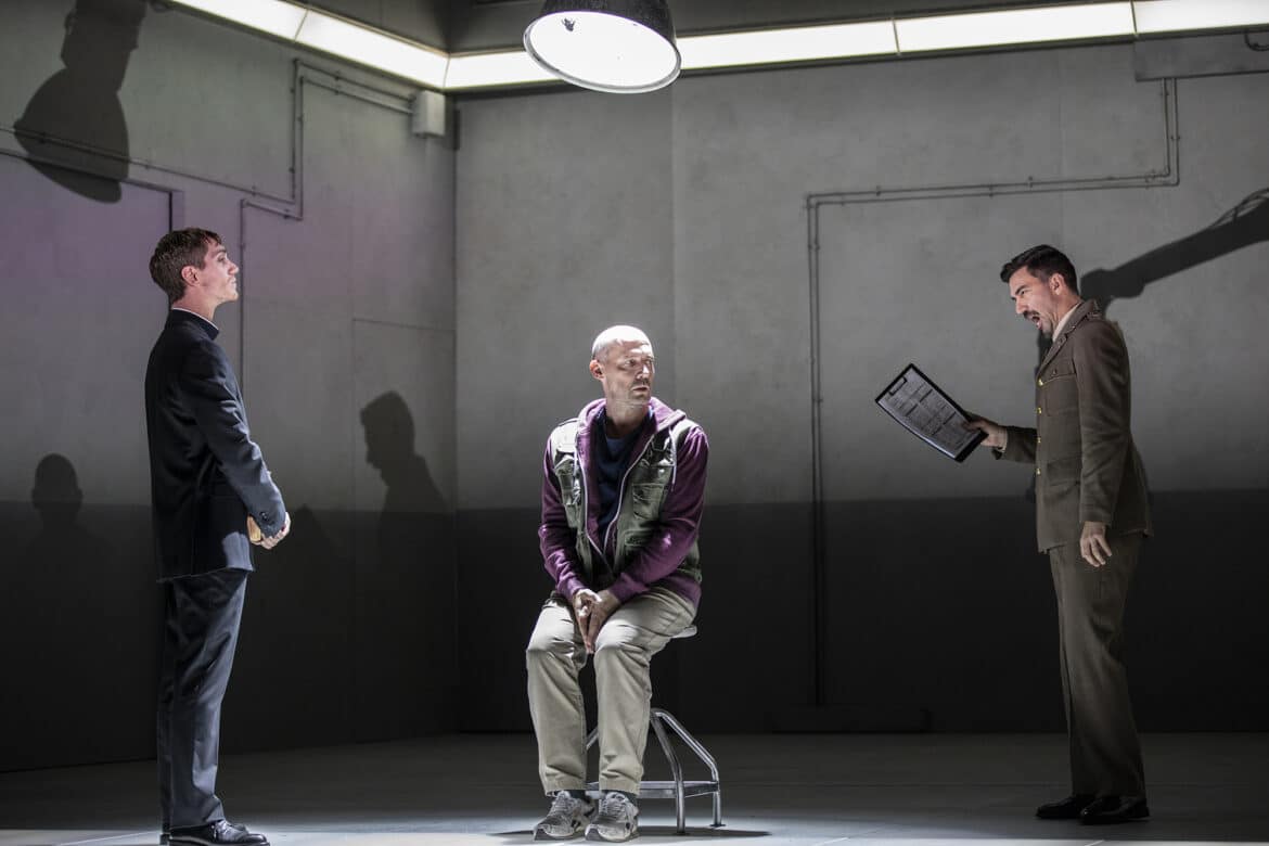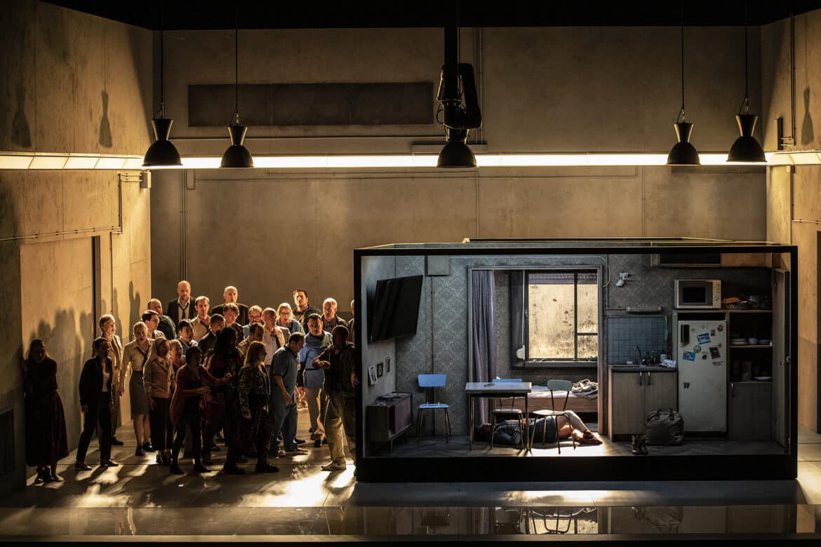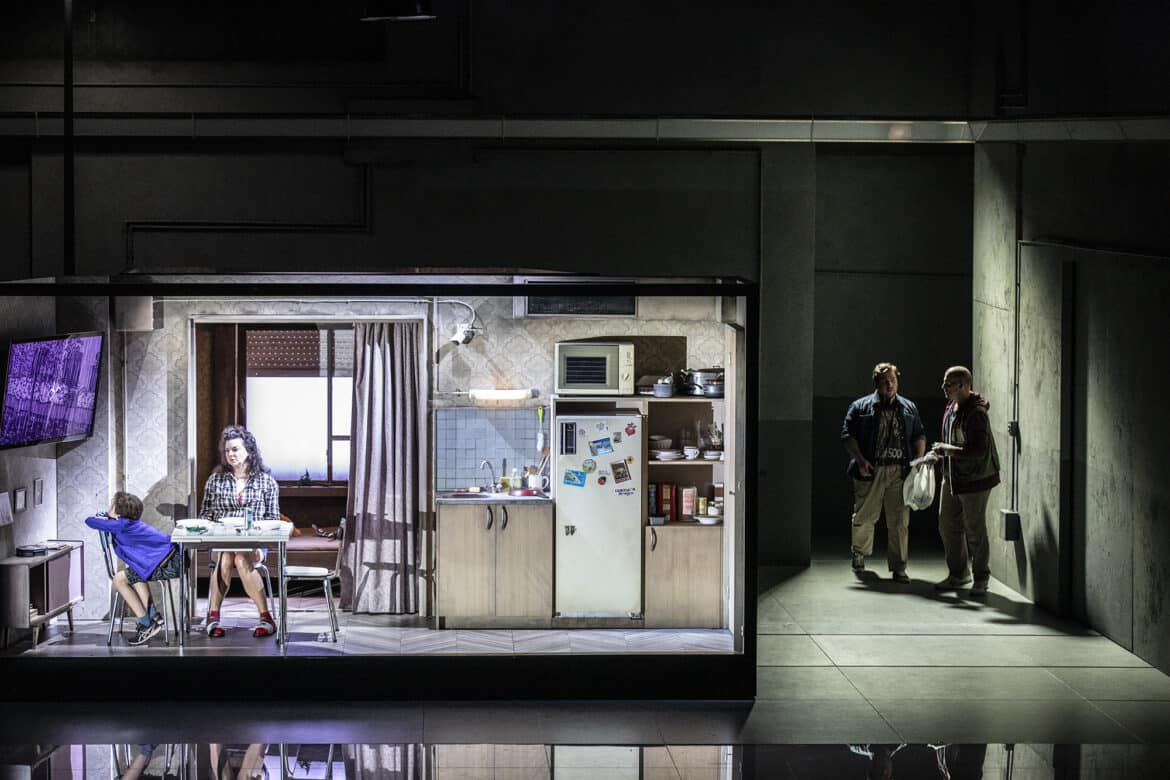 Opéra tragique, d’une redoutable difficulté musicale, Wozzeck n’est pas seulement un opéra très théâtral, par l’hypotexte de Büchner qui l’a inspiré, c’est aussi une œuvre cinématographique dans son déroulement narratif, quand la musique en révèle la modernité, sans répéter, comme le souligne Adorno, le simple contenu de l’œuvre littéraire. Situé chronologiquement entre les deux guerres mondiales, Wozzeck est une sorte de Janus qui regarde après et avant la catastrophe ; la phrase du héros, à la fin de l’opéra, éclaire en effet l’œuvre et son contexte tout à la fois : « L’homme est un abyme, on a le vertige quand on se penche dessus ». La lecture de Richard Brunel, aidé de son scénographe Étienne Pluss, souligne l’opposition de deux univers, celui de Wozzeck et de son inculture constitutive qui l’isole, et celui de ses supérieurs hiérarchiques (le médecin sadique, le capitaine hystérique) qui se moquent de ses lacunes intellectuelles. La dimension cinématographique continue (qui rappelle ici le célèbre film de Peter Weir the Truman Show), sans temps mort (et sans entracte, l’œuvre dépassant à peine une heure trente) est très bien rendue par un dispositif scénique qui mise à la fois sur une grande sobriété (l’œuvre débute par une scène quasiment vide, des murs gris, donnant l’impression d’un entrepôt désaffecté et déshumanisé, ou une salle de laboratoire plus froide qu’une salle d’hôpital) et les ingrédients angoissants d’une sorte de télé-réalité, symbolisée par la lampe-robot qui surveille le héros à son insu, harcelé et manipulé par les figures d’autorité que sont le docteur et le capitaine, et le conduira à la folie et à sa perte. Les apparitions des scènes de vie familiale dans les « roulottes » mobiles qui laissent apparaître le salon et la chambre de l’enfant, rendent parfaitement lisibles les fragments disparates du drame de Büchner pourtant intelligemment agencés par Berg. Les lumières de Laurent Castaingt contribuent efficacement à rendre palpable cet univers dystopique où domine la présence émouvante de l’enfant qui achève l’opéra en chantant.