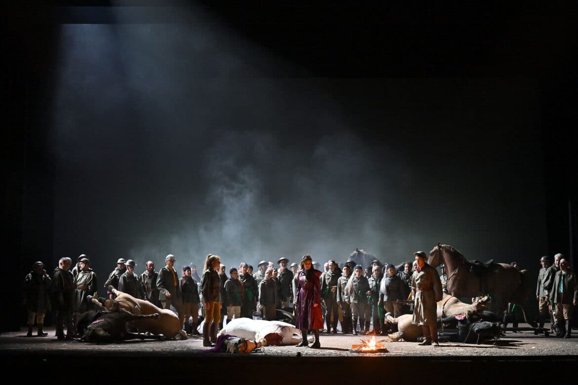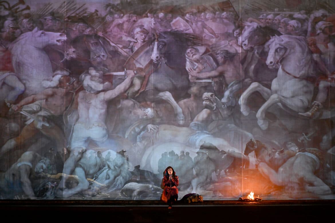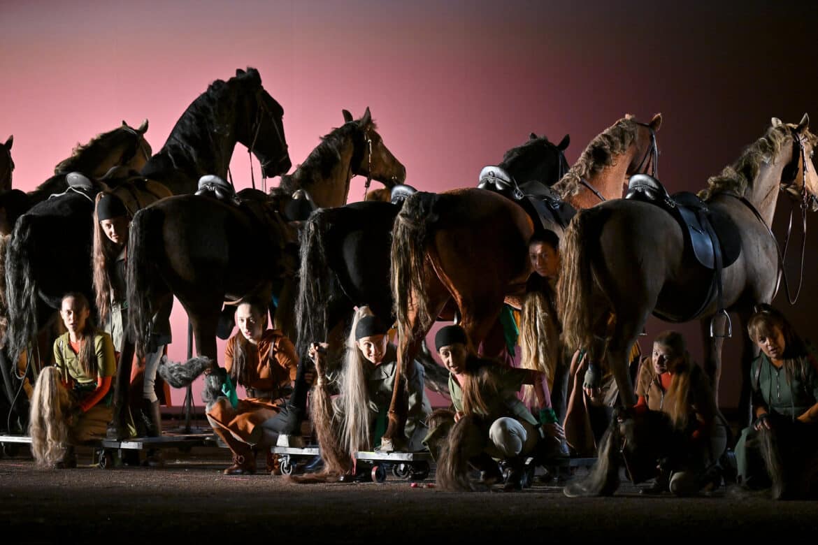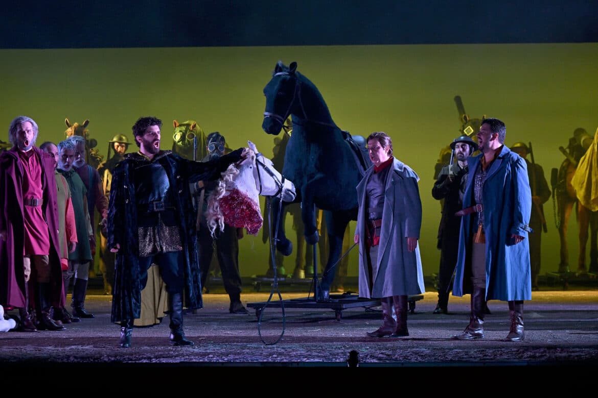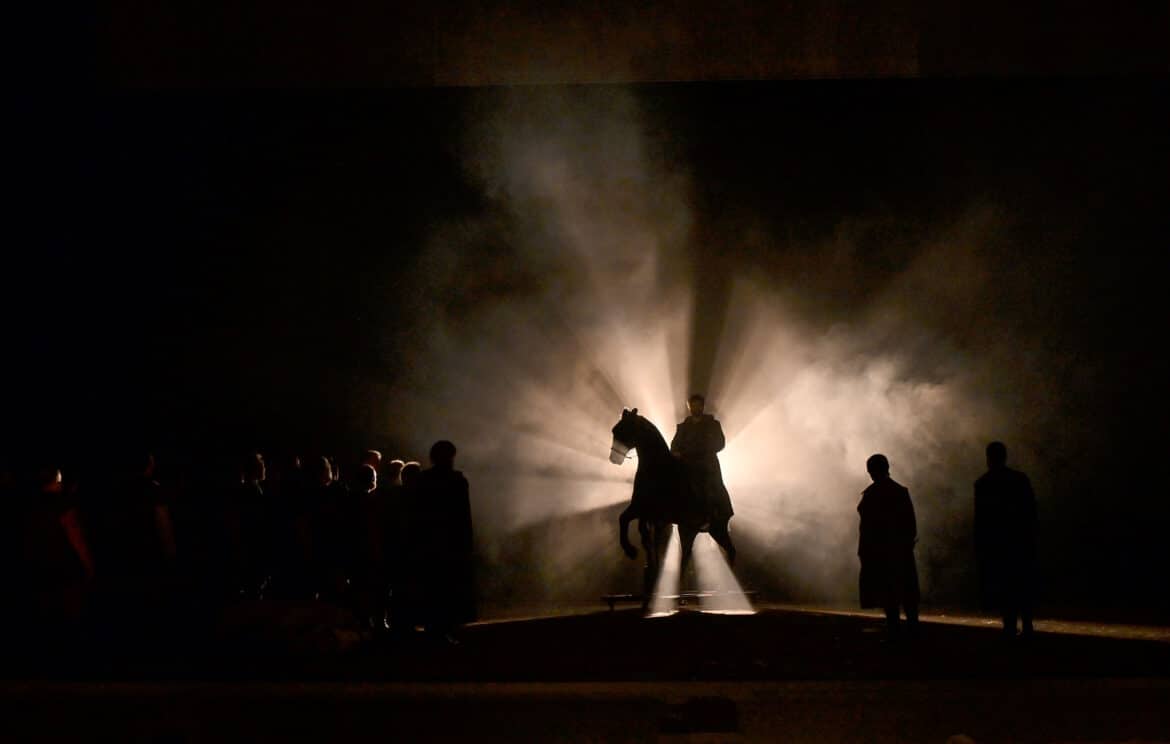Pour susciter de nouveau l’intérêt du public d’aujourd’hui, il faudrait un spectacle proposant des images entrant en résonance avec sa sensibilité et ses préoccupations actuelles, ou, peut-être, une direction d’acteurs qui soulignerait la violence des relations entre les personnages tout en essayant de leur conférer une certaine crédibilité… Valentina Carrasco n’y parvient pas totalement : la direction d’acteurs reste assez conventionnelle, et la tentative d’actualiser le propos et de lui donner une nouvelle force ne convainc pas vraiment. La lecture de Valentina Carrasco prend appui sur la représentation picturale d’une bataille (certains détails du tableau sont projetés à plusieurs reprises au cours du spectacle), dont la metteuse en scène retient avant tout l’élément équin, les nombreux chevaux présents sur scène symbolisant tantôt la bravoure, tantôt la majesté, tantôt la violence ou l’horreur de la guerre – notamment avec une carcasse de cheval décapité, abandonnée à l’avant-scène. Mais cette omniprésence des chevaux devient vite purement illustrative, et le mélanges d’habits médiévaux, du XIXe siècle ou plus contemporains, ou encore quelques beaux tableaux (l’apparition de Barbarossa) ne suffisent guère à soutenir l’intérêt…