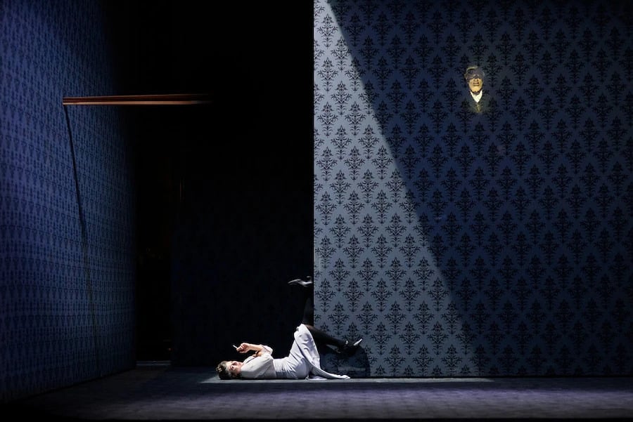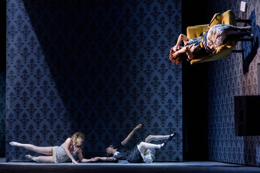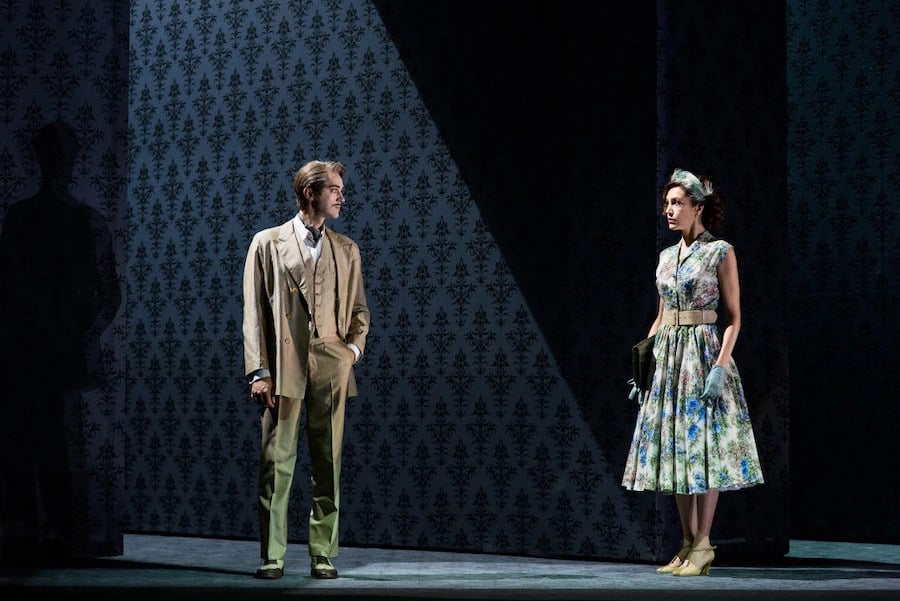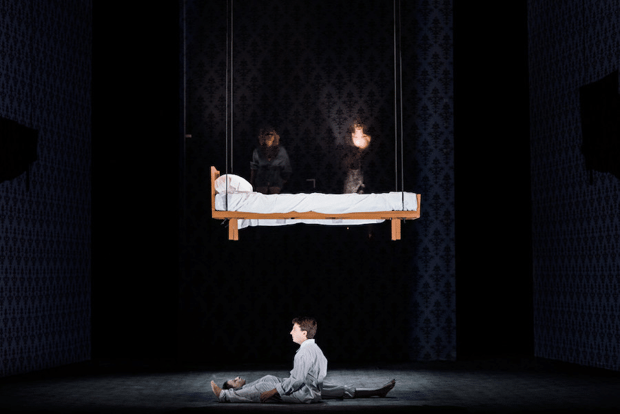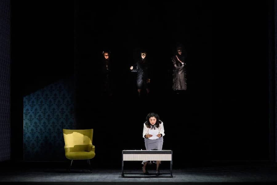 Davide Livermore présente les deux œuvres avec le même dispositif scénique, celui de Manuel Zuriaga déjà utilisé pour la production de 2017 au Palau de les Arts Reina Sofía de Valence, mais ici adaptée aux espaces du Teatro Ivo Chiesa, qui voit pour la première fois sa fosse d’orchestre utilisée. Les murs tapissés de vert foncé se déplacent pour reconstituer les différentes pièces et, à un moment, étouffent presque la pauvre gouvernante. Les perspectives varient, créant un monde irréel, avec les meubles suspendus au plafond, ou le lit sur le mur du fond, ou encore le fauteuil accroché sur le mur de droite. Les costumes de Mariana Fracasso sont magnifiques, inspirés de ceux de la pièce de théâtre des années 1950 et de ceux de l’opéra des années 1940.