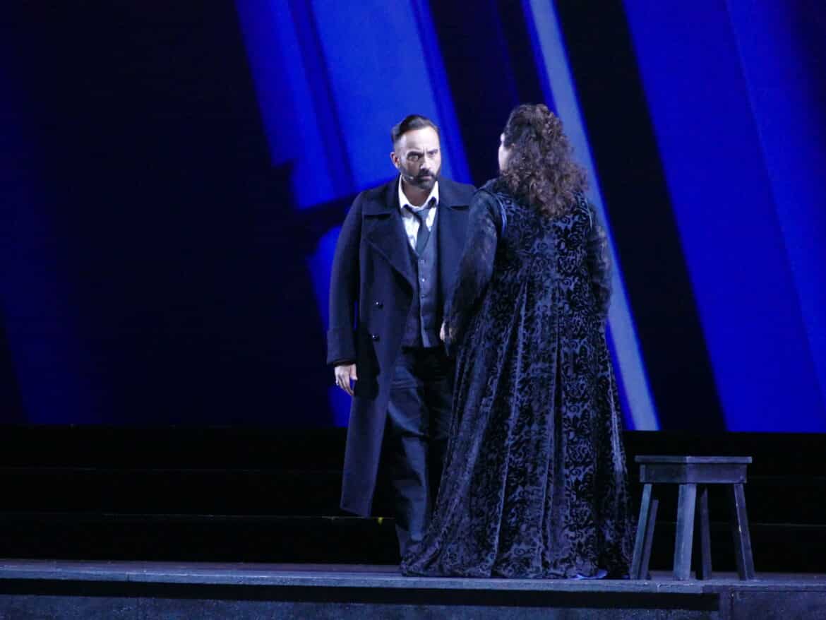 Si les personnages semblent un peu perdus, au premier acte, dans la demeure des Calatrava où la scénographie se limite à quelques fauteuils cossus et à un pratiquable auquel conduisent trois marches, placé en fond de scène, c’est la projection vidéo de longs couloirs lugubres qui retient davantage l’attention, comme symbole de l’étouffement quasi-carcéral dans lequel vivent les jeunes filles nobles d’alors en âge de se marier. Aux actes suivants, les lumières de Giuseppe di Iorio et les projections de fond de scène mises en place par Sergio Metalli nimbent le plateau d’une atmosphère de ciel crépusculaire (scène de l’auberge de Hornachuelos) voire de roman gothique avec ce ciel obscur d’où se détache l’ombre du monastère de la Madone des Anges et une imposante croix penchée à l’avant-scène. C’est cependant, à l’acte III, lors de la scène du campement, que le parti pris du metteur en scène de situer l’action pendant un carnaval populaire et macabre rappelant la peinture grotesque d’un Goya ou d’un James Ensor, chorégraphié par Marta Bevilacqua et mené tambour battant par une Preziosilla survoltée, permet enfin à cette production aux costumes intemporels de Paola Mariani de gagner un certain relief si ce n’est un véritable souffle.