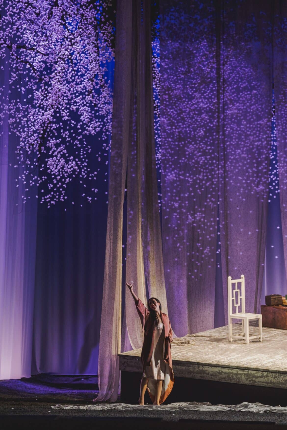 Le spectacle signé par Lorenzo Mariani avec les décors allant à l’essentiel d’Alessandro Camera, composés d’une estrade, de nombreux voiles et de quelques chaises, d’après les affiches et la photo du site du Maggio nous faisait craindre qu’il soit trop pauvre, froid et dépouillé, mais dans la salle, agrémenté des belles lumières de Marco Filibeck et de quelques idées « techniques », il apparaît élégant et non sans charme. Les costumes sont conçus par la très experte Silvia Aymonino, qui à la fin éclipse le Japon en habillant Butterfly et Kate Pinkerton (que le metteur en scène fait se déplacer avec une arrogance hautaine) dans une élégante robe noire identique, dans le style des années 1950 : une identité vestimentaire inexplicable, à première vue, étant donné qu’il s’agit de personnages aux antipodes (et pourquoi faire disparaître le Japon au moment où on s’apprête à se suicider selon un mode on ne peut plus japonais ?), mais un critique de cinéma présent dans la salle (Gabriele Rizza) m’a signalé la citation probable d’Hitchcock : la robe de soirée noire est la dernière portée par Kim Novak avant de tomber du clocher dans le film La donna che visse due volte (La femme qui a vécu deux fois), titre de la version italienne de Vertigo. Une interprétation peut-être un peu forcée, étant donné que Cio-Cio-San meurt, et non Kate, et que Madame Butterfly ne revivra pas en elle. Une autre citation plus reconnaissable est la scène dans laquelle Butterfly et Suzuki, trompés par l’arrivée du navire de Pinkerton dans le port, parsèment la pièce de fleurs, le fond étant également rempli de fleurs projetées : il s’agit ici d’un rapide hommage à la mise en scène inoubliable de Samaritani, débordant de vraies fleurs, qui à chaque représentation, à l’ouverture du rideau, suscitait une expression d’émerveillement du public florentin (repris pendant plusieurs années, ce spectacle fut vendu dans l’un des moments sombres de l’histoire du Maggio ; il est réconfortant de savoir qu’il n’a pas été détruit et qu’on le met en scène parfois à Berlin).