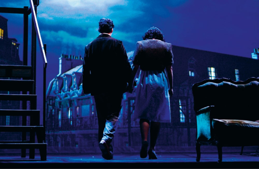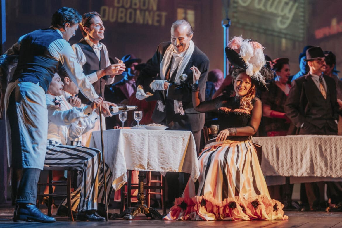 C’est à mi-chemin de l’atmosphère d’un film de René Clair (Sous les toits de Paris, 1930 ; Quatorze juillet, 1933) et d’une scénographie qui lorgne à l’occasion vers le cinéma de Marcel Carné et de Jean Renoir que nous projette Jean-Louis Grinda dans cette superbe production, donnant à voir ici, tout à la fois, son amour du théâtre musical et du cinéma français de l’âge d’or. Certains pourront sans doute écrire que la mansarde de Rodolfo et de ses compagnons de fortune fait davantage penser à un loft parisien avec vue panoramique sur les boulevards : peu importe, après tout, puisque cela permet au spectateur d’assister, grâce aux belles lumières de Laurent Castaingt, à un passage vers le crépuscule puis la nuit qui, au premier acte en particulier, met en évidence, comme rarement, les splendeurs de la partition ! C’est au deuxième acte, dans le décor parfaitement adapté mais jamais tape à l’œil de Rudy Sabounghi, particulièrement fourni en colonne Morris et en affiches tapissant l’espace scénique (telle que celle de cet apéritif oublié, le fameux « Du Bo/ Du Bon/ Du Bonnet » !) que la passion du metteur en scène pour camper une atmosphère et en dégager tout le parfum se manifeste avec le plus d’éclat : sachant faire évoluer comme personne sur le vaste plateau de la salle des Princes, solistes, artistes du chœur et chœur d’enfants, belles de nuit toutes droites sorties d’une toile de Jean Béraud, danseuse des Follies et figurants nombreux, Jean-Louis Grinda signe avec ce café Momus aux couleurs bigarrées, dans des costumes superlatifs de David Belugou, l’une des plus scènes de genre auxquelles il nous ait été donné d’assister ces dernières années. C’est pourtant avec le naturalisme intimiste de l’acte dit de la « Barrière d’Enfer » que cette mise en scène en tous points admirable est la plus réussie : ici, si la neige tombe bel et bien et, de la façon la plus réaliste, reste au sol, c’est parce qu’elle répond au dessein poétique du metteur en scène et vise, détail parmi d’autres, à mettre en évidence un imaginaire et le génie d’orchestrateur de Puccini, particulièrement à la manœuvre dans cet acte.