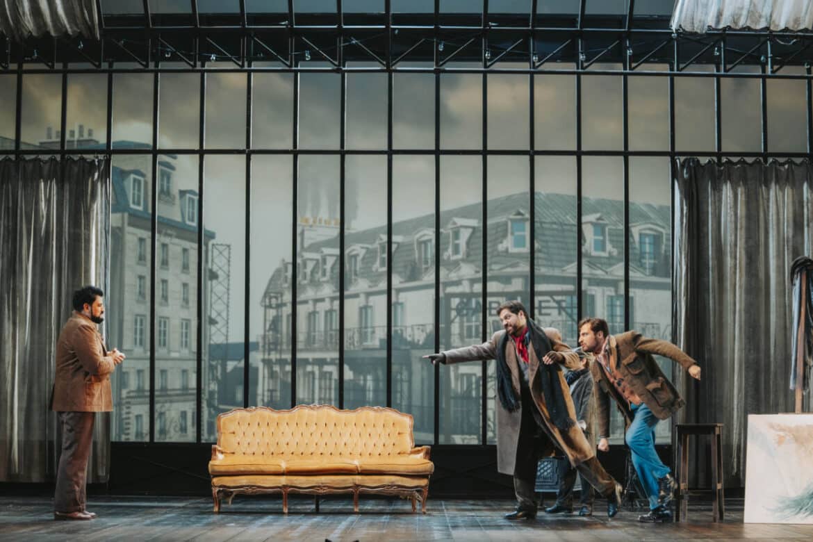 On se doit encore de relever, dans cette mise en scène, la parfaite cohérence de traitement entre des scènes comiques – l’apparition du propriétaire Benoît au premier acte, la succession des déguisements des comparses, au dernier, jusqu’à leur simulation d’un match de boxe, gants à l’appui ! – avec leur équivalent dramatique : l’entrée brutale sur le plateau de Musette annonçant l’état de santé désespéré de Mimi constitue ainsi un climax qui n’a rien d’un cliché et réussit même à nous surprendre par sa force, car en parfaite harmonie avec l’accord violent de l’orchestre à cet instant, tout comme cet envol d’oiseaux à la sobre poésie funèbre préludant au déchirant cri final de Rodolfo. Cette image restera gravée longtemps après la fin de la représentation tout comme celle de la main de Marcello retrouvant finalement celle de Musetta.