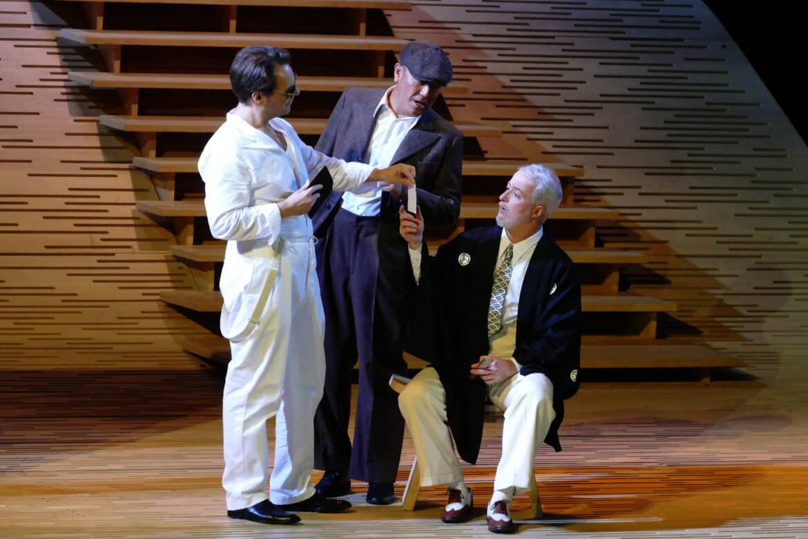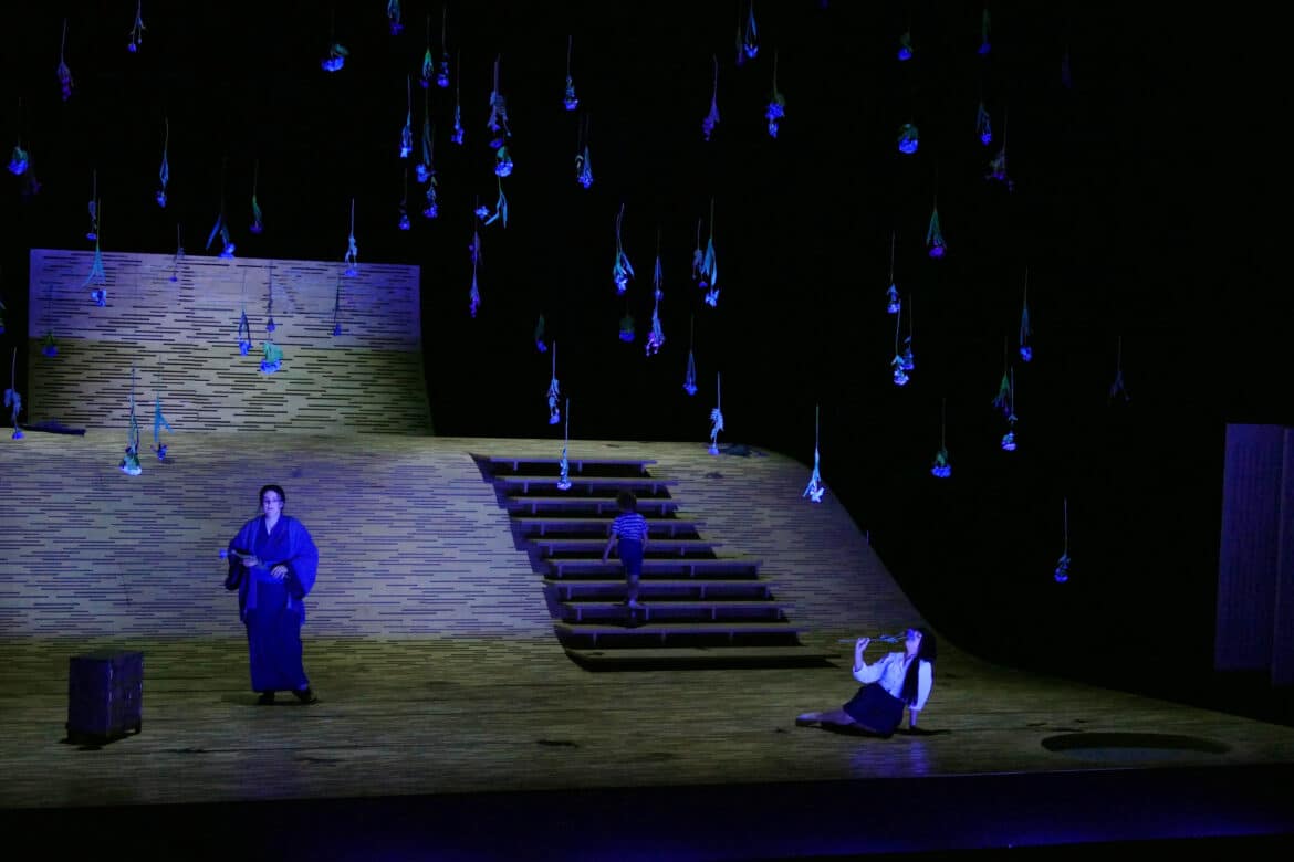 En effet, la mise en scène, d’un rare classicisme, pose dans leur siècle des personnages non « revisités ». Sharpless, le consul, chanté par Marc Scoffoni, est la copie conforme de la version Rudolf Piehlmayer à l’Opéra de Rennes. Les costumes de Véronique Seymat respectent une japonité et une américanité simples, mais très modérées pour Cio-Cio San, en voilages bleus, aux traits asiatiques très peu marqués, faisant de la frêle geisha une femme assez universelle. En tenue de sous-officier de la marine américaine, Pinkerton, campé par Thomas Bettinger, est on ne peut plus « tiré à quatre épingles », blanc puis bleu gris, ce qui montre peut-être une évolution du personnage vers une certaine complexité. Dans ce contexte, seul le chapeau de la robe de mariée surprend (Cio-Cio San est originellement, « Madame Chrysanthème », dans le roman de Pierre Loti), d’une parfaite blancheur, ovale, très grand, avec des allures futuristes. Les trouvailles scéniques sont rares, modestes mais bienvenues, comme la « pluie » de fleurs – des tiges nombreuse descendues par des fils, mises en lumières par Bernd Purkrabek – dans l’acte II. À noter aussi l’usage de vastes paravents ou murs en bois amovibles (entre tradition et modernité), très bien utilisés pour symboliser par exemple l’enfermement de Cio-Cio San. Philippe Do incarne avec justesse l’entremetteur Goro, en habits modernes, aux allures de petit gangster.