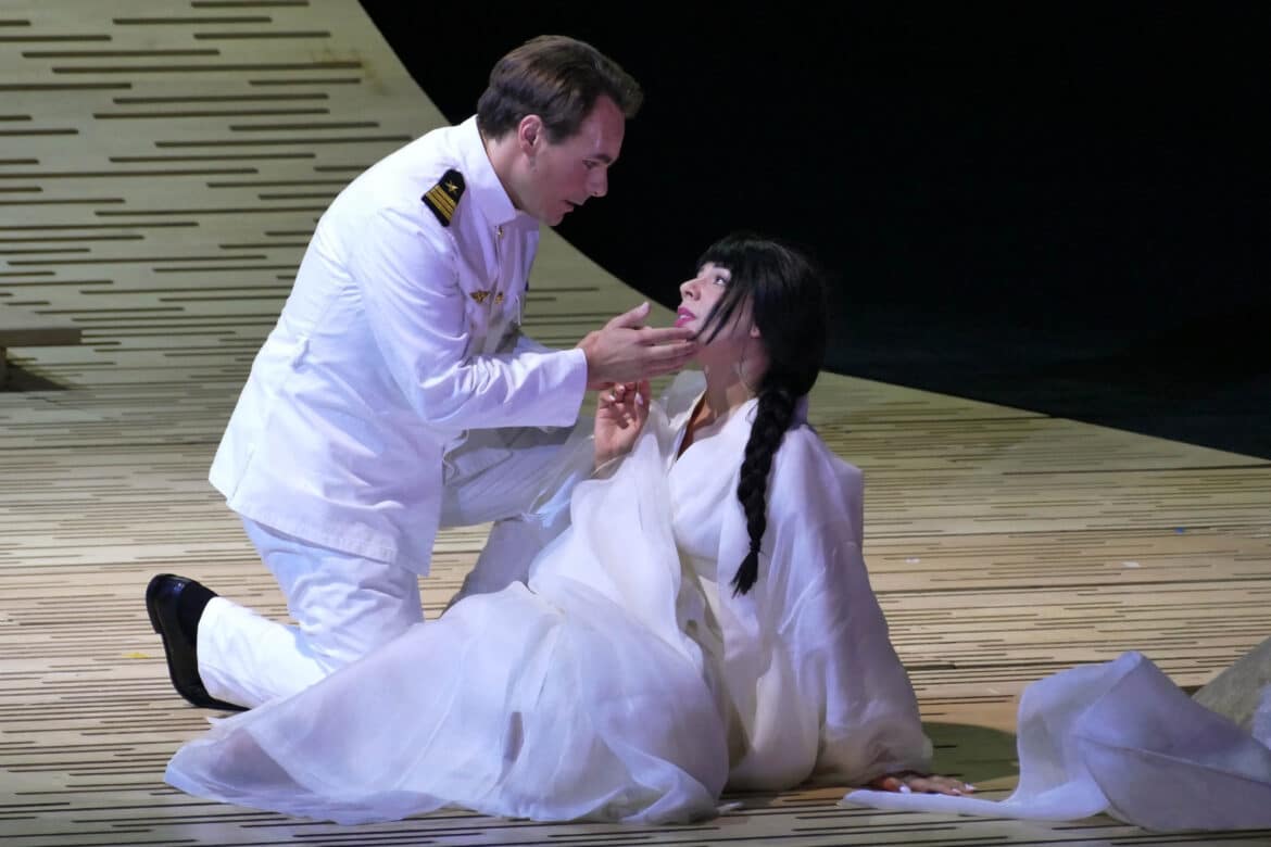 Les deux voix principales, celles de Thomas Bettinger en Pinkerton et d’Alexandra Marcellier en Butterfly, sont assez fraîches, en devenir – cette dernière est une récente Révélation aux Victoires de la musique, de même que la mezzo Eugénie Joneau en Suzuki (en 2022). Le ténor et la soprano ont fait leurs études à Bordeaux et se sont fait connaître il y a peu sur la scène, en Cavaradossi (Tosca), en Micaela (Carmen), ou précisément… en Butterfly, dans un remplacement de dernière minute à Monte-Carlo. Ces voix n’ont peut-être pas l’ampleur, le soutien vocal, le timbre des immenses stars qui ont endossé ces rôles ; mais elles possèdent la sûreté suffisante pour satisfaire l’exigeant public marseillais. C’est notable dans l’air de l’espérance « Un bel dì, vedremo » de Madame Butterfly, au début de l’acte II, ainsi que dans la façon d’envisager un parlando (qui est un stile misto parfois proche de la conversation), manquant d’intimité et de pureté au profit d’une forme d’agitation. Sur certaines notes, la voix est recouverte par l’orchestre. Mais cette fébrilité vocale et dramatique de Cio Cio San, qui attend et s’interroge, est paradoxalement ce qui contribue au côté tragique du rôle et à la marche de l’action.