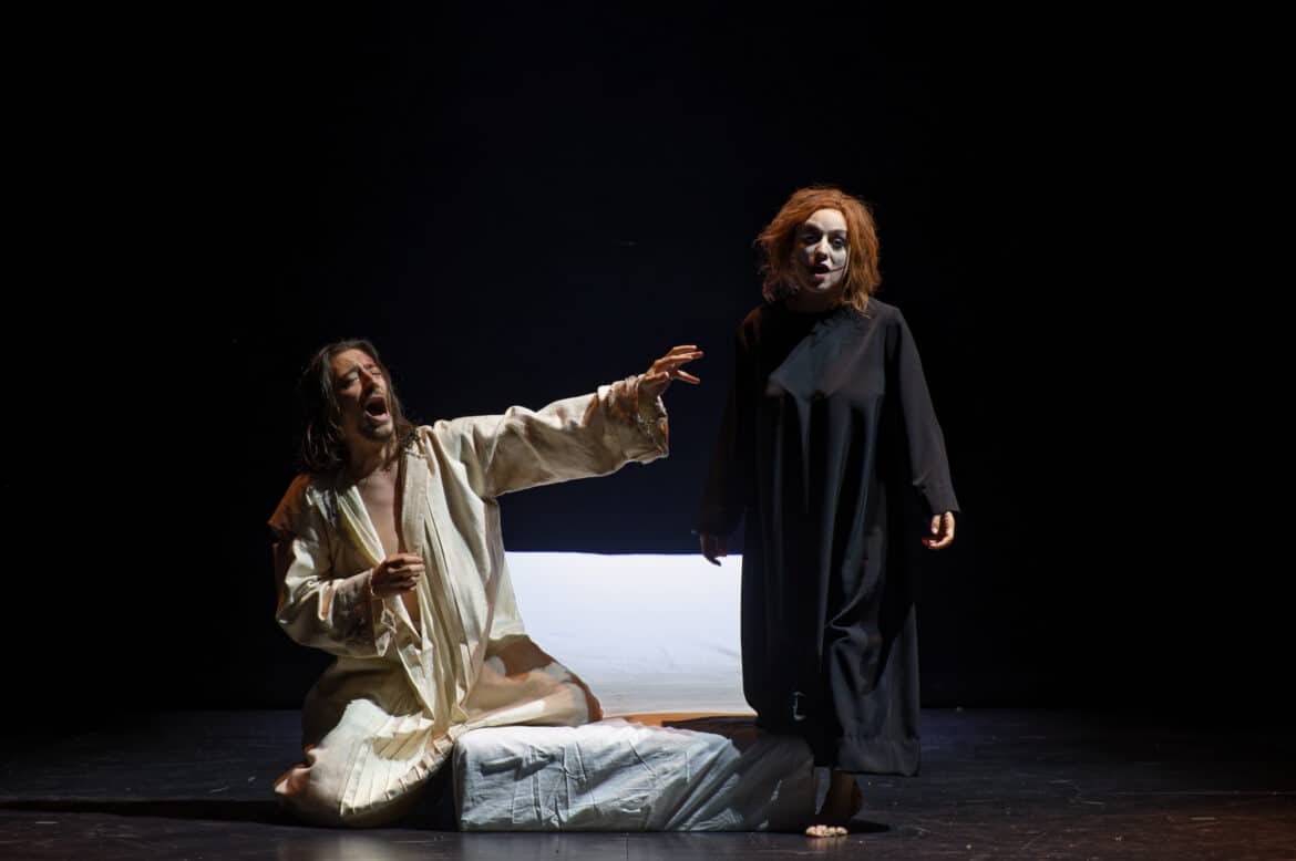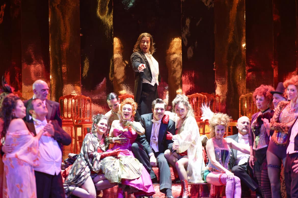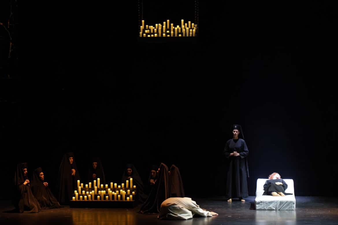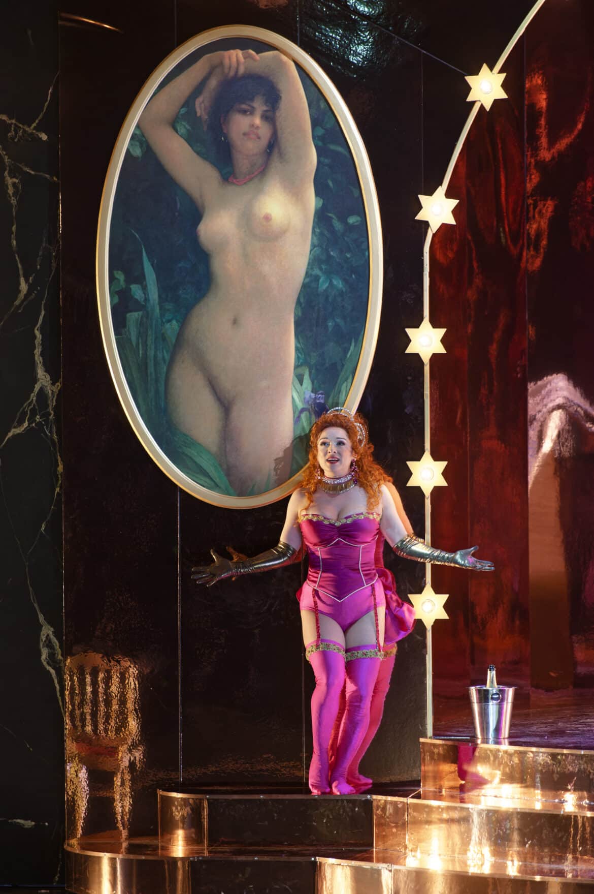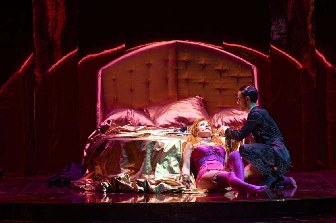 La mise en scène de Pierre-Emmanuel Rousseau propose quant à elle une transposition habile du livret original, qui renouvelle la vision de l’œuvre tout en en respectant les enjeux dramatiques. Thaïs, courtisane et actrice du IVe siècle, attachée au culte de Vénus, devient ici la danseuse d’un cabaret où les messieurs viennent apprécier un peu plus que sa voix et ses pas de danse… Myrtale et Crobyle sont ses collègues, et Nicias le propriétaire de ce nouveau « temple de Vénus ». La transposition fonctionne, ne « force » jamais l’œuvre, et le metteur en scène qui, fidèle à ses habitudes, réalise aussi les décors et les costumes du spectacle, nous donne à voir quelques tableaux saisissants, tels Nathanaël couché sur le ventre, les bras en croix, sous un immense crucifix suspendu (une étonnante « image inversée » du Christ…) ; ou encore la scène dans laquelle Thaïs, venant d’être violée par Nicias, semble telle Eboli « maudire sa beauté » et se taillade le visage – peut-être en signe d’un châtiment qu’elle s’inflige à elle-même pour se punir d’actes passés qu’elle condamne désormais, mais plus certainement encore pour dissuader d’autres hommes de l’approcher et de jouir de sa beauté.