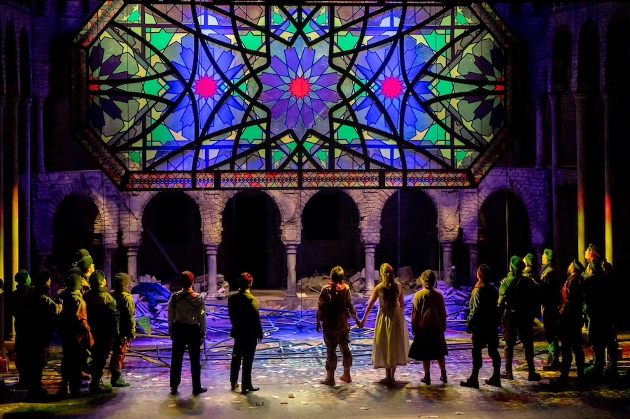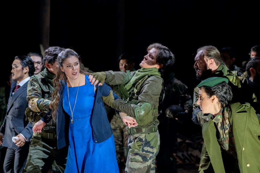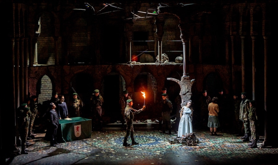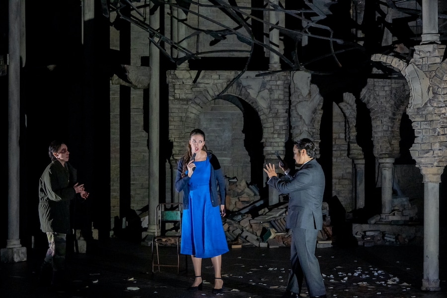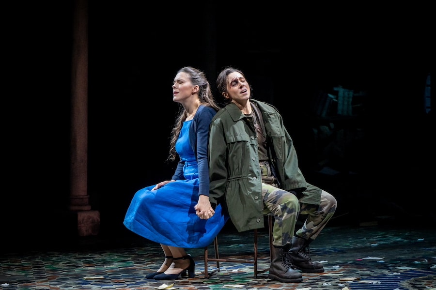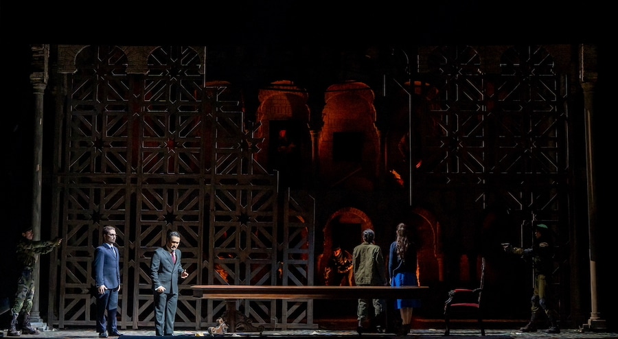Le spectacle de Bruno Ravella est sobre et cohérent, avec une mise en scène efficace et convaincante. La guerre est hélas d’actualité non seulement dans notre réalité quotidienne… mais aussi dans Zoraida, et le metteur en scène a judicieusement transposé les événements de l’Espagne de 1480 à l’époque de la guerre des Balkans : l’action est située dans un lieu qui rappelle la bibliothèque de Sarajevo dévastée par la guerre et recréée ici par le scénographe Gary McCann dans son style mauresque. Le jeu d’éclairage exquis de Daniele Naldi ajoute une touche dramatique supplémentaire. Les costumes sont également signés McCann : un costume rigide à double boutonnage pour le tyran Almuzir, une tenue de camouflage militaire pour les hommes, une robe bleu clair et une robe blanche pour la protagoniste. Nous sommes plongés dans les années 1990, mais nous pourrions tout aussi bien être dans les années 2020, le décor permettant de combiner le passé avec la culture et le temps présents, la figure du personnage principal tentant de préserver tant bien que mal un monde qui s’effondre. La lecture de Ravella met en évidence la futilité de la guerre : si l’œuvre se termine sur une note positive, cela n’ôte rien à l’impression que nous éprouvons de pertes irréparables…