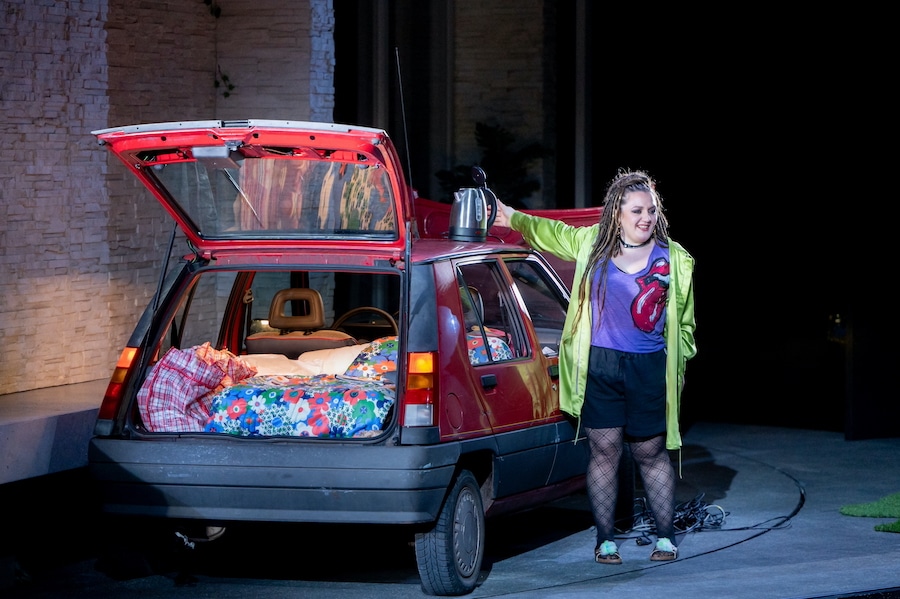 Pour cette autre incursion dans l’univers de Donizetti, la metteuse en scène allemande néglige les lectures fortement idéologiques qui ont caractérisé ses autres productions, pour tout miser sur l’humour, un humour brut qui transforme cette comédie mélancolique en un reality show de mauvais goût. Le dispositif scénique de Maria-Alice Bahra rappelle celui conçu par Pizzi pour La pietra di paragone au Rossini Opera Festival 2002, mais une villa beaucoup plus « bourgeoise » : au lieu d’une piscine, on trouve un petit bassin, peut-être un bain à remous. Le bâtiment est monté sur l’habituel plateau tournant, de sorte que l’on peut également voir l’arrière de la villa où est garée une Panda rouge.
