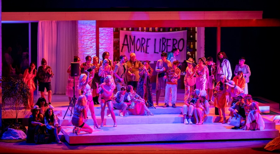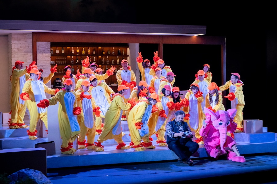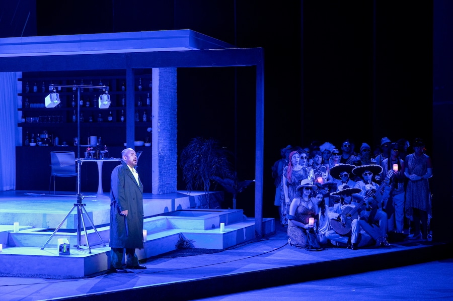 Les domestiques qui, dans le livret du troisième acte, commentent les « interminables allées et venues » des coiffeurs, bijoutiers, fourreurs, couturières dans une maison où l’on dépense sans compter sont ici une foule de chamans invités à une fête. Que la romance d’Ernesto soit accompagnée de trois mariachis, ou le fait qu’à un moment un petit éléphant traverse la scène devant le rideau, ne surprend guère…