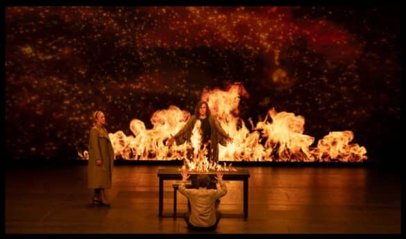 Quelque trois heures plus tard, nous sommes ressortis de la salle bruxelloise avec l’impression d’avoir, pareillement, assisté à un spectacle escamoté. Le livret, signé d’un habitué du genre cinématographico-lyrique (Vavrek a signé deux adaptations de films de Lars von Trier : Breaking the Waves de Missy Mazzoli et Melancholia du même Mikael Karlsson), donne déjà une indication des choix opérés dans le découpage du film. La place accordée au théâtre y est réduite – seul son simulacre sous la forme d’une maquette dans le salon des Ekhdal l’évoque au début et à la fin de l’œuvre – et la trame des intrigues familiales réduite à sa plus simple expression – une allusion aux tracas financiers de l’un, aux infidélités de l’autre, à un désir d’enfant inassouvi… et guère plus. Chez Bergman, la passion du théâtre et la comédie douce-amère de la saga Ekhdal conditionnent de façon crucialre le caractère des deux enfants, rendant plus insoutenable par contraste la partie dramatique de l’intrigue. Or, c’est justement sur le drame que Karlsson, Vavrek et le metteur en scène Ivo van Hove ont choisi de mettre l’accent, au prétexte que « regarder des gens prendre du bon temps n’est pas intéressant du point de vue dramatique » (notes de programme). Rappelons brièvement la suite de l’histoire : un an après la mort de son mari Oskar lors d’une répétition de Hamlet, Emilie Ekhdal accepte la demande en mariage de l’évêque Vergerus et s’installe chez lui avec Fanny et Alexandre. Ces derniers, en particulier le garçon, vont subir brimades et violences de la main de leur rigoriste beau-père. Lorsqu’Emilie comprend son erreur, il est trop tard : elle est enceinte de Vergerus et tout divorce est impossible, car ses enfants seraient alors confiés à l’évêque. Seul un stratagème ourdi par Isak Jacobi, ami de la famille Ekhdal, leur permettra de lui échapper, avant qu’Emilie parvienne à son tour à s’enfuir et que Vergerus périsse dans l’incendie de son presbytère. Un incendie peut-être provoqué – incité – par les pouvoirs surnaturels d’Ismael, le neveu de Jakobi avec lequel Alexandre se sent en étrange symbiose… Le finale voit la famille au complet à nouveau réunie autour d’un banquet pour le baptême du bébé d’Emilie, laquelle annonce qu’elle va diriger le théâtre municipal et propose à sa belle-mère de remonter sur scène.