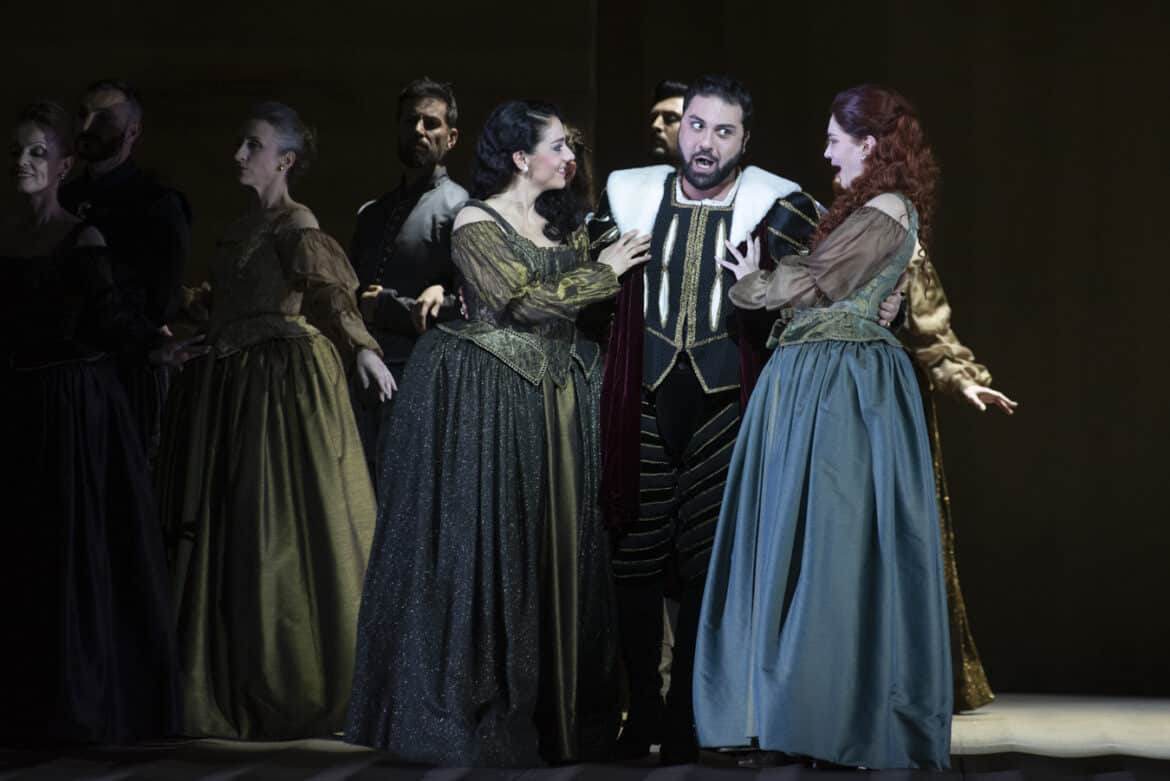 Une complicité aussi bien scénique que vocale s’installe alors avec le duc de Liparit Avetisyan, lui aussi débutant sur la première scène lyrique nationale (et déjà Duc de Mantoue dans l’admirable Rigoletto de Jérémie Rhorer à la Côte Saint-André en août 2022), étudiant faussement et efficacement timide dans le tableau des aveux amoureux. Au premier acte, sa barbe lui donne une allure à la François Ier, personnage archétypal dans le drame-source de Victor Hugo (Le roi s’amuse). On sait que le rôle du Duca constitue la parenthèse belcantiste, voire donizetienne, la plus voyante au sein d’une partition qui cherche de nouvelles formes d’expression, sans doute la plus novatrice de ce que l’on a pris l’habitude d’appeler la trilogie populaire. Ainsi dans son air de présentation, les transitions vers le haut du registre sont superbement gérées et l’agilité est sans reproche. À l’acte II, l’articulation sonne légèrement approximative dans le récitatif de sa grande aria, alors que la cavatine est abordée tout en force et la cabalette, privée de son éclat, révèle quelques fâcheux conflits avec les vers de Piave. Mais la canzone de l’acte III débouche sur un aigu vigoureux.